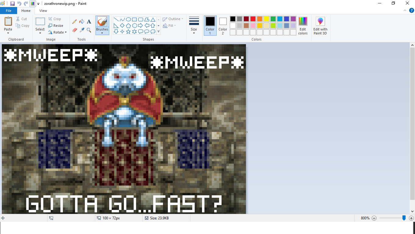 Working on my pattern for my SGDQ 2024 prize donation and could use some assistance getting the picture together. zora with text and right size is what I'd like the final product to look like and the size I'm shooting for (since I'll likely be having to stitch everything/there is little background color, we want to keep this on the small side for time involved. 100 pixels/stitches one way is good and then 71 just happened to be how things worked out based on the ratio of the original throne room shot). Looks fine at 100%, but zooming in to 800% which is basically what I stitch at, each pixel is a stitch, so best to see things at that zoomed in rate, things look rather blurry and my fear is that is what the final product will look like. Sprite sheet I got King Zora from is also included. Was too small relative to the throne room (also attached) as originally drawn, but going to 150%, he fit good. Initial problem was copying him into the throne room, we had white background (see attached). A friend of mine figured out how to make the background transparent and that got us the docx file attached. Put the two images together and convert to PDF (also included), copy the picture from that and we get zora test 3.png. Which is super and awesome and way the heck too big (I know, 504x362 is no big deal for some of you guys, but I only have 3 or 4 weeks to do this). Shrink down and we get the aforementioned blurriness. Anybody here good with digital image manipulation? As I said, 100x71 is a good size, so that's what we're shooting for. And if that means simplifying things (especially the throne room), I'm fine with that. Once I get the pic, I can throw it into KG Chart Pro for colors, or take my laptop to Michaels and match colors, don't have a set number in mind. We blew things up to get the docx file/images therein, so maybe we can manip the original Kong Zora sprite/throne room and shrink down from there? png with the text I want to use is also included, but that is easy to insert. Big problem is getting King Zora and the throne room to look good at the size I want. Any assistance would be appreciated (aforementioned friend is still seeing what she can come up with, but I sent it to my sister, who also does stitching and some designing, and she was at a loss. But the more the merrier). Event is the end of June, but I want to make sure the framer has plenty of time to get it done, allowing for quirks that come up, plus I need to stitch this, which as I said, I hope to do in a month or less, so I'd like to start stitching the middle/end of February. So this isn't a rush job, but would like to have things in place, have my colors picked and bought, and so on.