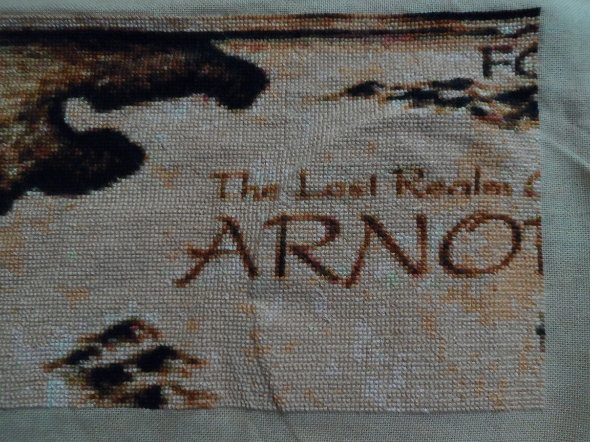 It says "The Lost Realm of Arnor." The detail isn't always so clear. And I hate stitching the mountains. So many close but not close enough confetti stitches.