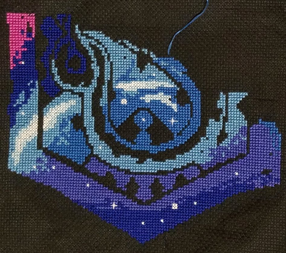 My big ol' logo is all done (pattern posted on the original thread) and started filling in Hawkeye. Huge progress on Visit Mordor Finished this ancient UFO of a Dimensions kit