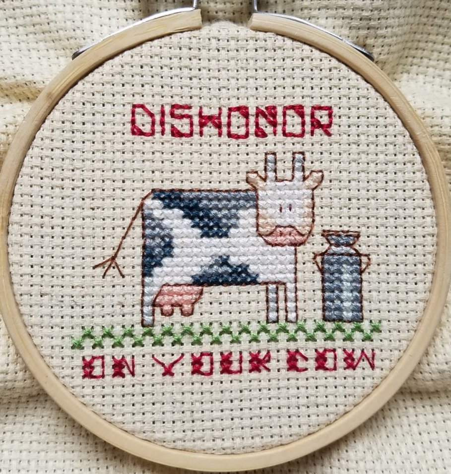 Visit Mordor - Complete ~22.5k stitches [Night Sky] Slytherin Crest - Complete ~9.1k stitches Night Flight - Complete A silly piece I cobbled together one night - reference to Disney's Mulan and gave me a chance to do this tiny cute cow and an update on my Hello Kitty Avengers piece - WIP