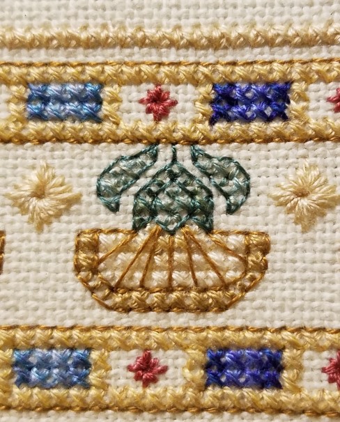 Special Stitches: The vertical stitching are large cross stitch over 4 threads with a contrasting running stitch. The part above the head contains satin stitching, a large eight sided eyelet and partial eyelets.
