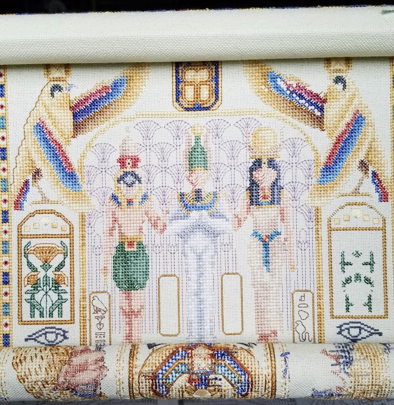 and Egyptian Sampler was unrolled today. Since my last post here, I've worked on the Queen's over-1 face and added around 1700 backstitch.