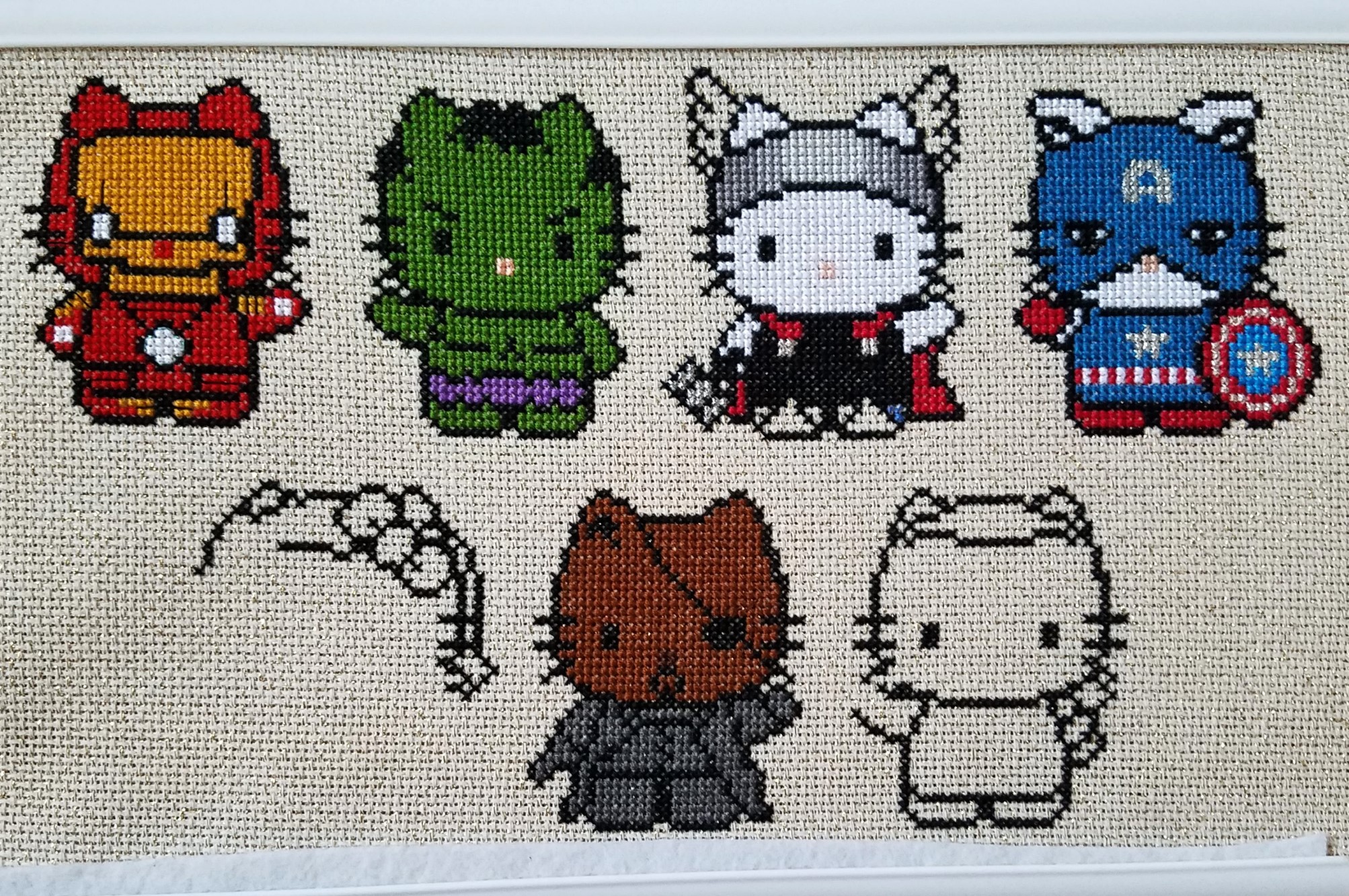 Speaking of kitties, I finished another Hello Kitty about a week and a half ago. Say hi to the Captain (Fluffybutt). Once I got a suitable blue blend for the uniform, it went quickly. I also designed an A for his helmet which is in dark silver metallic and did the stars and part of the shield in light silver metallic... and I finished Hawkeye's outline and started Black Widow. CatThor still needs 90 more stitches after some color picking.