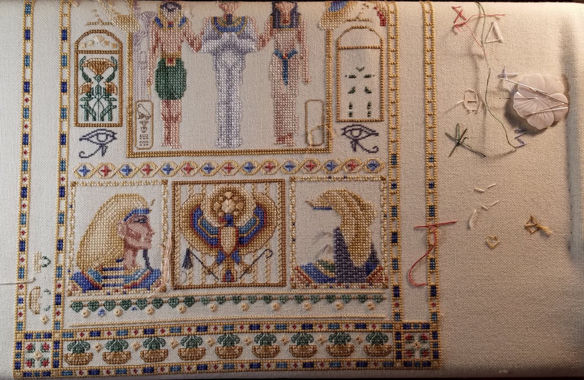 Because of my wrist issues, I decided to just do some short sessions averaging a total of 50-100 stitches a day on my Egyptian Sampler. When I felt better, I was motivated to continue stitching on it and got several good nights in. I meant to post updates sooner, but I haven't even turned on my PC in weeks