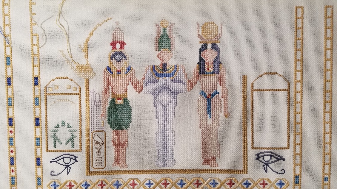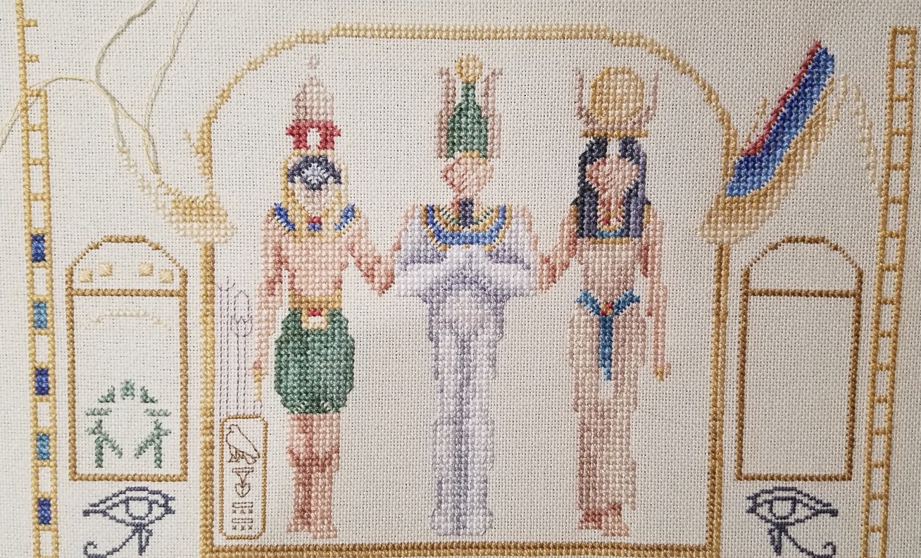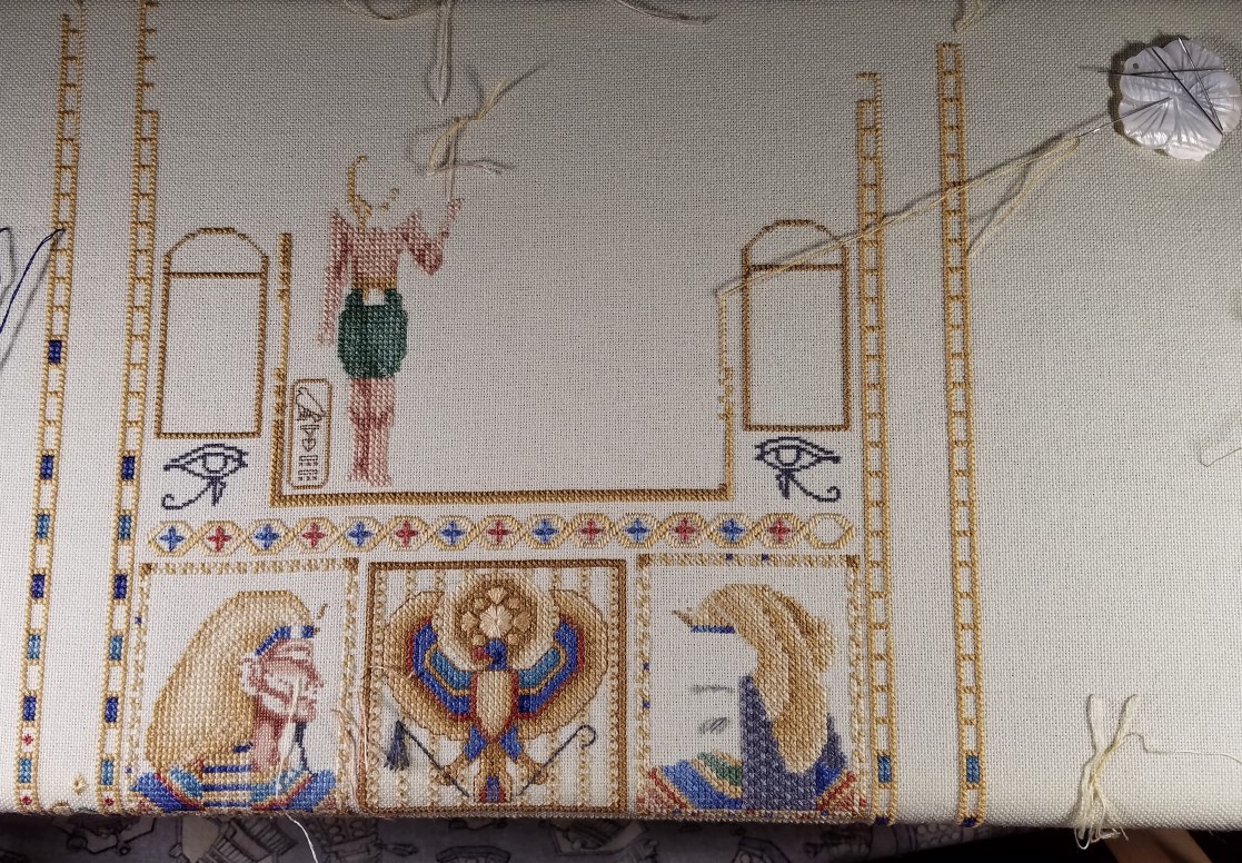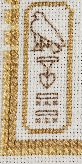 I think my favorite part is the mini hieroglyphic panel. Most of the cross stitching is done in the center. I have around 1-2 dozen stitches left. but I do have 3 more hieroglyph sections, backstitch outlines and blackwork in the background.