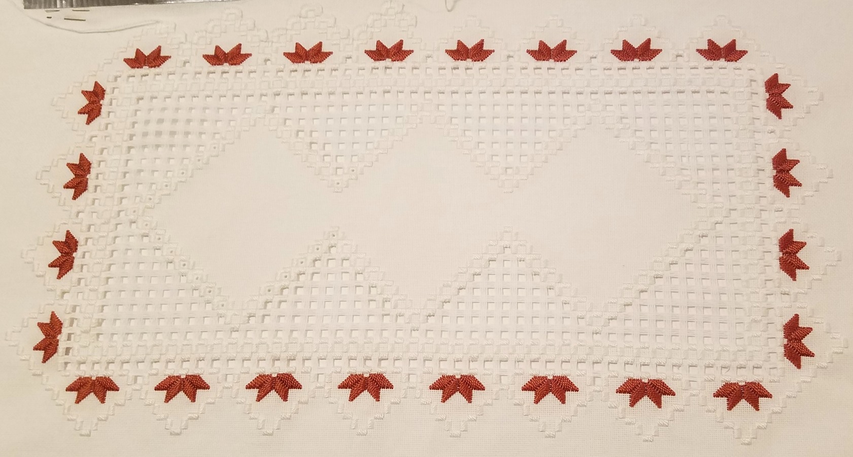 I finished the last bit of the cut and drawn thread work and stitched some (half-)stars in med. terra cotta (dmc 356) around the entire piece. Got some more eyelets done and, after a few bad starts (I'd already half forgotten how to do the edgings), was able to make headway on the buttonhole stitch around the edges.