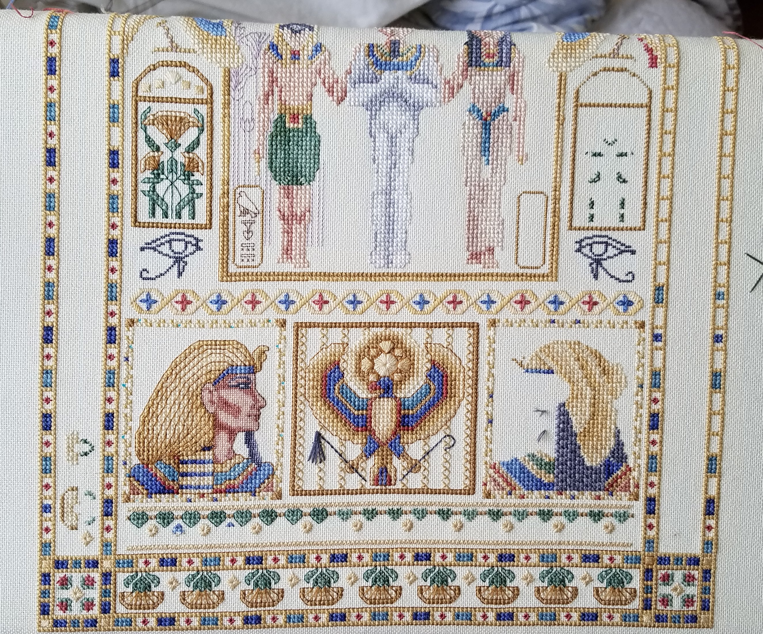 Update on my Egyptian Sampler. I've started the papyri at the top and filled in a little in various places like the eyelets in the left border and finally finished the over-1 stitching on the Pharaoh. I even did all the backstitching on him and, let me tell you, there was a lot. I just have the confetti stitches and back-stitch in his border to do. I still have to finish the Queen now, but at least she's got way less backstitch for her headdress, one less color in her face and no beard.