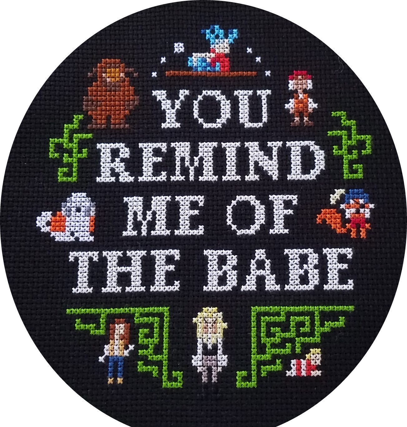 The original pattern called for the maze design to be stitched in the same gold color as mini-Sarah's vest. I picture green hedge mazes whenever I think of the movie. I also wanted to tie in the hoop's color and so changed it to DMC 906. Yep. That dreaded green that's so prevalent in my Mario and Bubble Bobble stitches, lol.