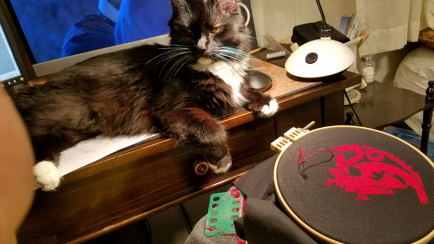 Second one, tossed my highlighter aside, laid across the entire pattern and kept pausing my show by hitting the spacebar with his butt. He stared at me for 15 minutes or so until I gave up for the morning and went off to do something productive. lol