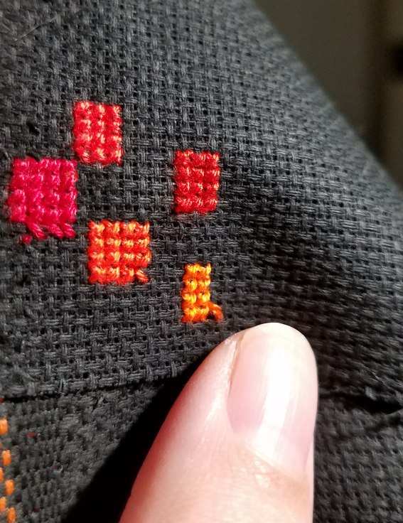 Testing colors. I figured if I had to use 7 skeins of it, doing ~70 extra stitches isn't a big deal. So glad I did because the pattern recommended bright orange (the one next to my thumb, though it's not quite as bright as this photo shows). This is 16 ct aida by the way.