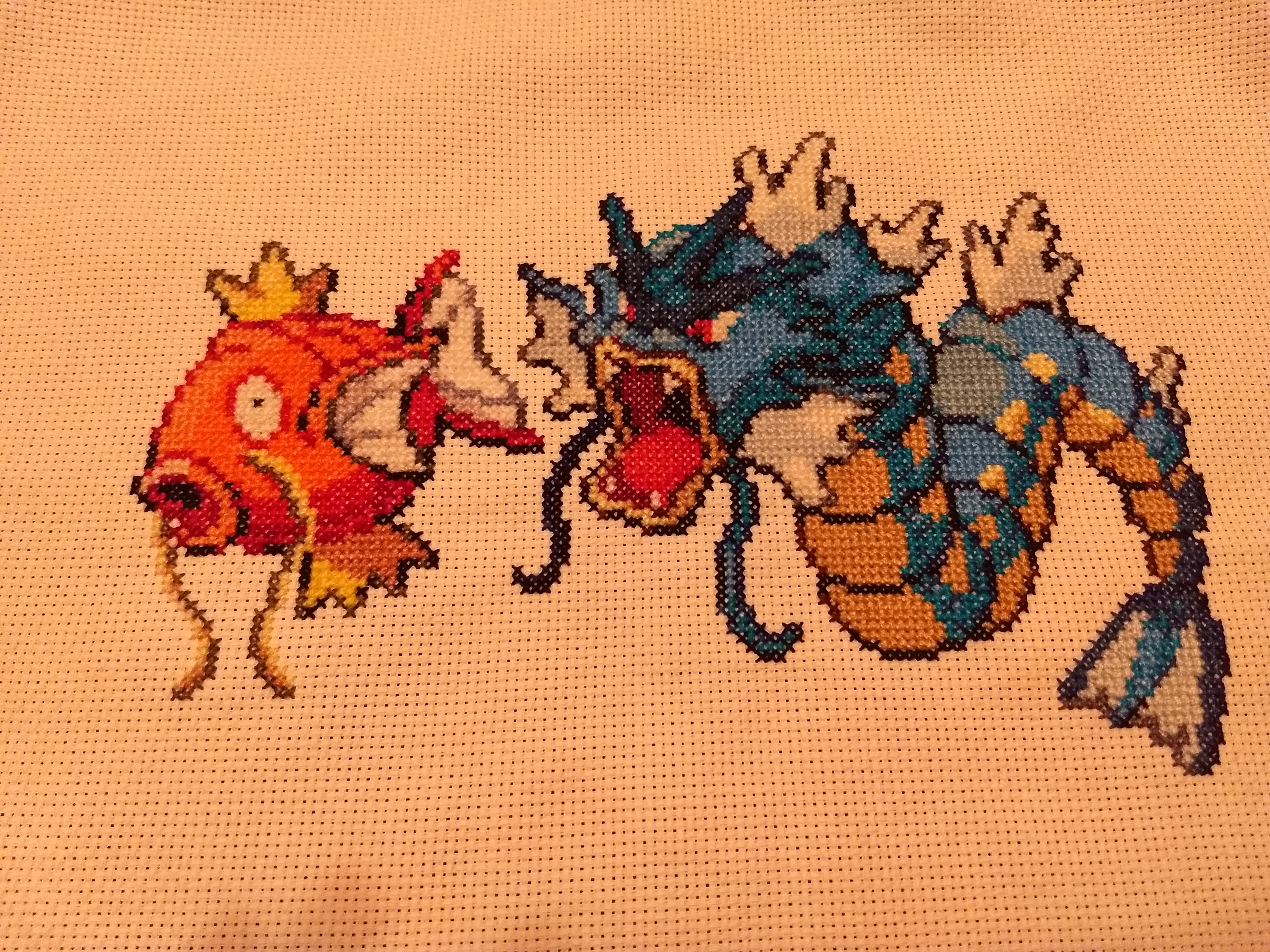 My first ever cross stitch: the pokeballs, and the other I made for my brother because Magikarp is his fave.