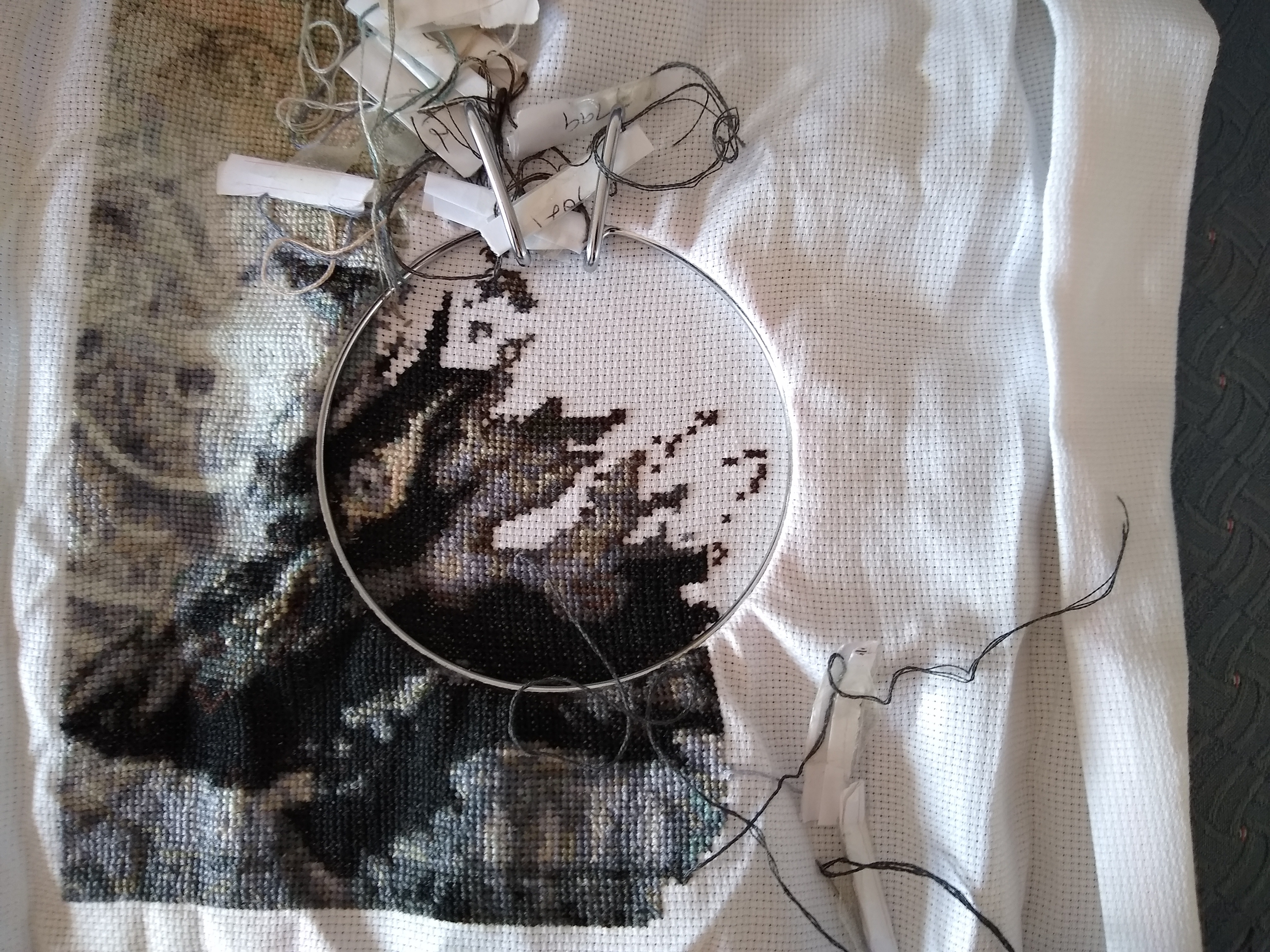Progress is being made. Excited about where we are because as you can see, we're at the top of the picture. So we finish this hoop and we've finished our second column. As an aside, choosing to go up and down the picture, rather than right and left, or going around the edge then filling in the middle is proving to be the smart move and easier move. I can easily scroll through the pages up and down keeping the cursor in place to keep track of where I am, rather than trying to go up and down the pages, but shifting left and right in the picture. Some right and left movement still, but this is much easier. So two columns about done, I'm figuring 5 total, though it'll prolly be closer to 4 1/2, which we can't actually do, so round up to 5. But, I included the pen cap not only for scale, but also as a reference point. The left side of the pen cap is just about the middle of the picture, both left to right and up and down. So you can see we've actually stitched part of the right half of the picture, though not much. So I put us at roughly 40-45% done overall. If my calculations are right, I've been working on this for about 21 weeks. Some of that was all the black in the wolf, so the second half won't go as quickly, but we can ballpark things, say another 28 weeks of stitching, which is 7 months. Do have my SGDQ prize to do here in April, so that will delay this, but end of September maybe we finish this? Be faster than some of my other guesses, but we'll see. Expect the current hoop to take prolly another two weeks or so to do. Move the hoop to the right for the next one, figure end of March or so to finish that. Pause for SGDQ, then rest of summer and on is finishing this. Lot of work here, but still enjoying it and things are moving along, one stitch at a time (for those wondering, the whole picture is 136 stitches by 200, so all told, I'll be doing 27,200 stitches, not counting the stuff I've had to undo/redo and such).