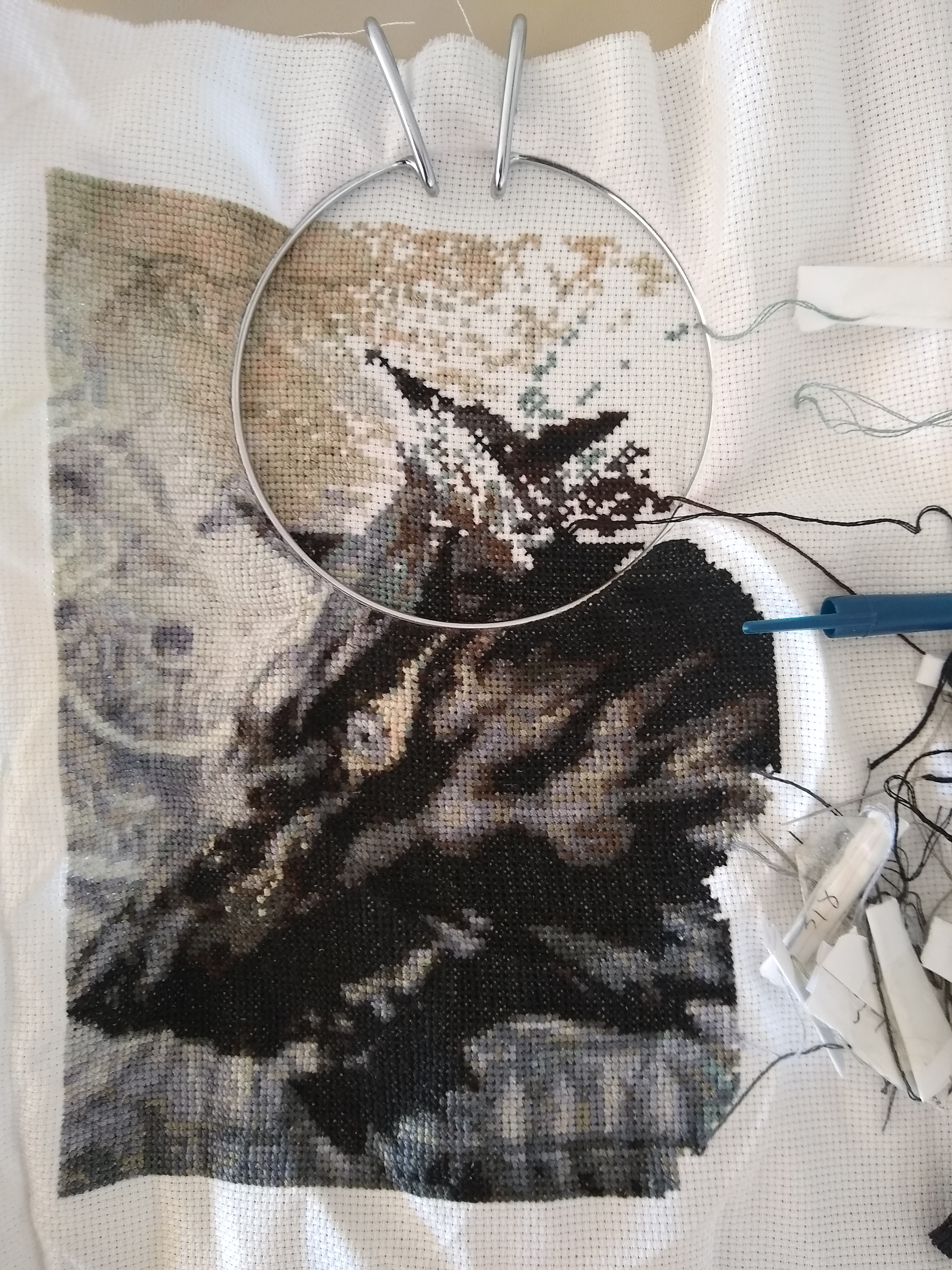 Day after day, I don't see much change, but that's why I'm taking pics every few weeks, so the growth and change is more evident. One stitch at a time, we're getting there. Did catch another mistake where the hoop was in the above picture and while I don't think I can fix it, I can make do and roll with it. But we'll have to come back to that down the road. Meantime, we've moved the hoop up to the next section and are stitching away. At least another couple of weeks to fill this hoop, but there's a lot of black of the wolf here, too, so that'll move things along.