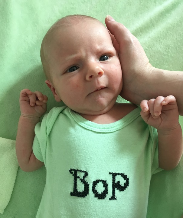 Of course geeky baby clothes are often hard to find and way too expensive when you do find them, so what's a girl to do but make her own? I ended up using waste canvas to cross stitch onto a bunch of plain onesies. Most of them are way too big for Jack currently (I made them before he was born and didn't want to risk them being too small), but I had to make his BoP onesie in a newborn size (that's Bind on Pickup for any of you non-MMORPG-ers out there). I guess I have to keep him.
