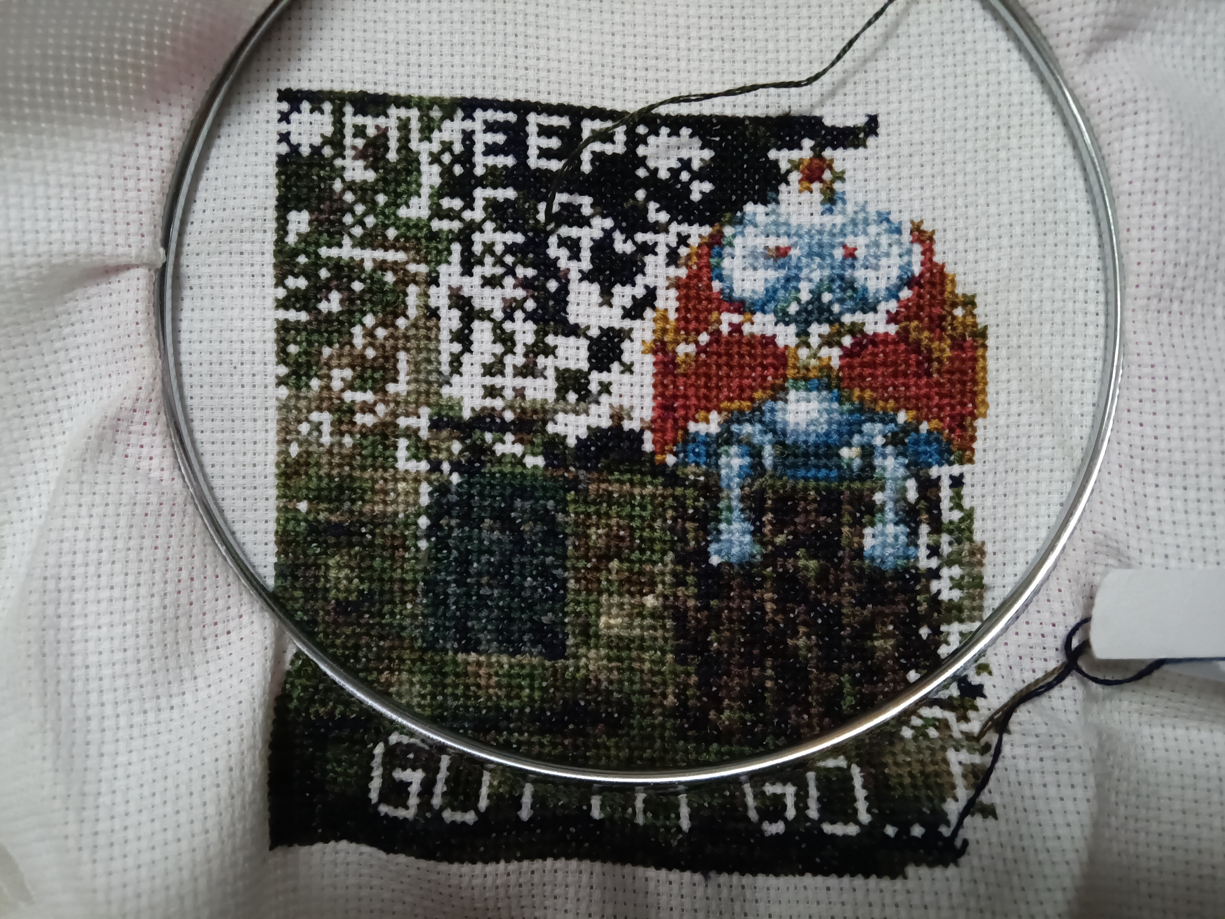 Thank you. It's been a lot of work and while I may not have bitten off more than I can chew, we got ourselves a rather large mouthful. :) Yesterday wasn't my best day as I found one mistake that meant undoing/redoing about 20 stitches and then another smaller mistake undoing (haven't redone yet) about 5. So those cost me some time. However, I have moved the hoop, I've gotten the top row completely done except for a couple of stitches and found/stitched part of my right edge. With the hoop in its current location, I'll be able to do a great majority of the rest of the work. Won't be able to get the lowest 10 rows or so, and maybe not the bottom 15-20 on the edge. So by the time we move the hoop again, we'll be 90ish% done? The amount of white I'm seeing now is a bit intimidating, but one positive of yesterday was following a color from the right edge down and connected up with what I'd stitched weeks earlier. So we still have a huge patch of white in the middle, but it's less intimidating. Off today, but already had a meeting that killed a couple of hours and have stuff this afternoon, so doubt I'll get to stitch as much as I'd like, but we'll see what we can do. Finishing by the end of this month seems dubious at our current rate, but we'll see how far behind we are as the month progresses.