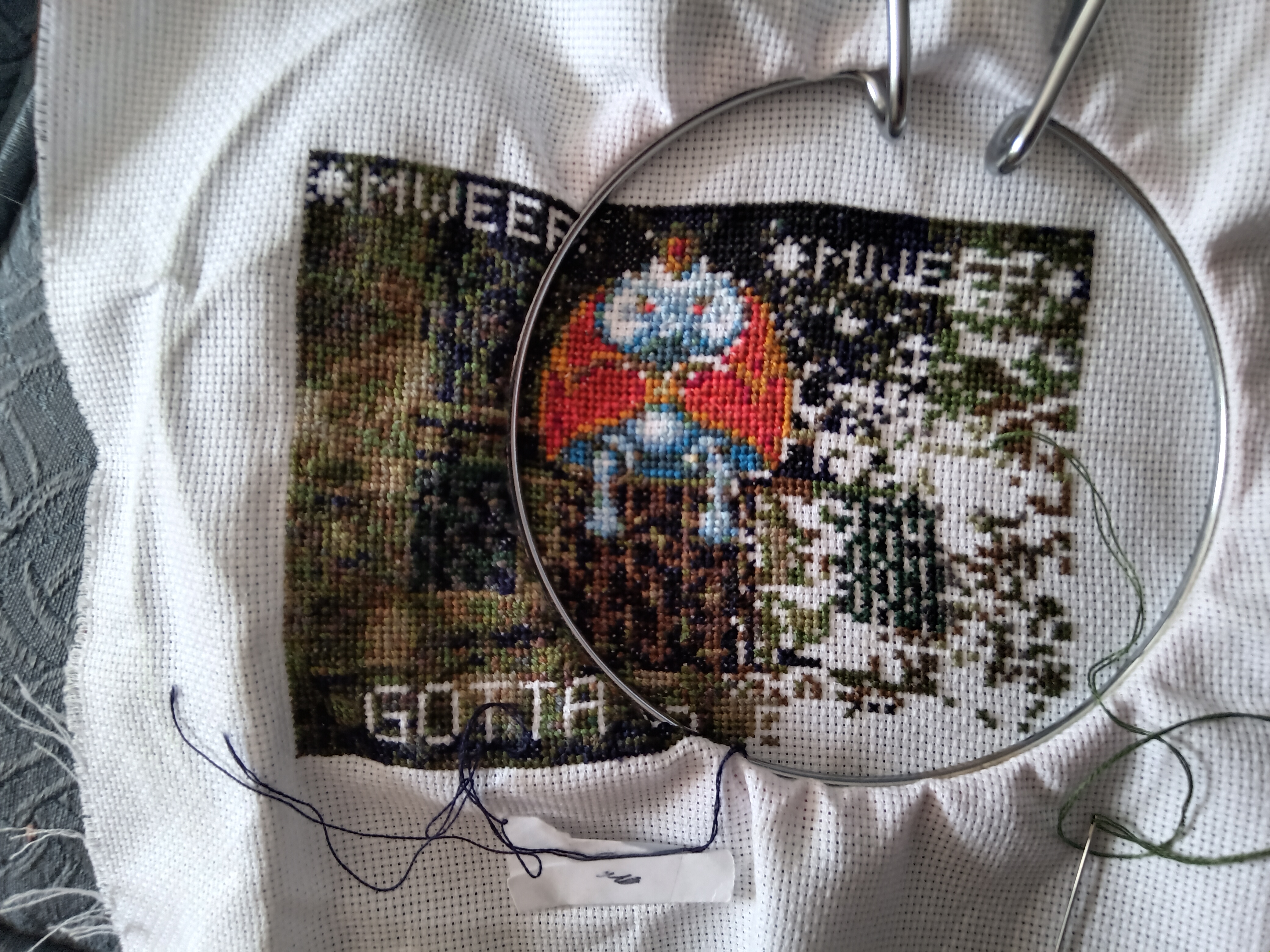 Thank you. :) Not fair to compare the work done in the first pic to the second since the second had essentially an extra week's worth of work done, doing 90 minutes a day rather than 60. But because of that, yeah, we have gotten a lot done. Still a lot of little gaps and spots, but I also see a lot that has filled in. I think because I haven't moved the hoop yet, I'm psyching myself out and I really have done more than I think, but we'll see later this week/next week once we move the hoop up and get the top border identified/stitched. Once I do that, I think I'll have a much better idea of how far along I've come, and how much I still have to do. End of this week would be 5 weeks working on this, or the halfway point, so theoretically, I ought to be about halfway done then. The left side of the O in "go" is our halfway point horizontally and the top of King Zora's legs/base of his body is about the halfway point vertically, so we can see that much of that has been stitched. Whether I fill all that in by the end of the week remains to be seen, but I have done work outside that square, so total number of stitches is near/over halfway already. At this point, unless I start feeling burned out or not enjoying things anymore, I'll keep to 90 minutes a day until we finish and if we wrap up early, so much the better to give The Artery a few extra days to get it framed. But we'll see what the next few weeks bring.