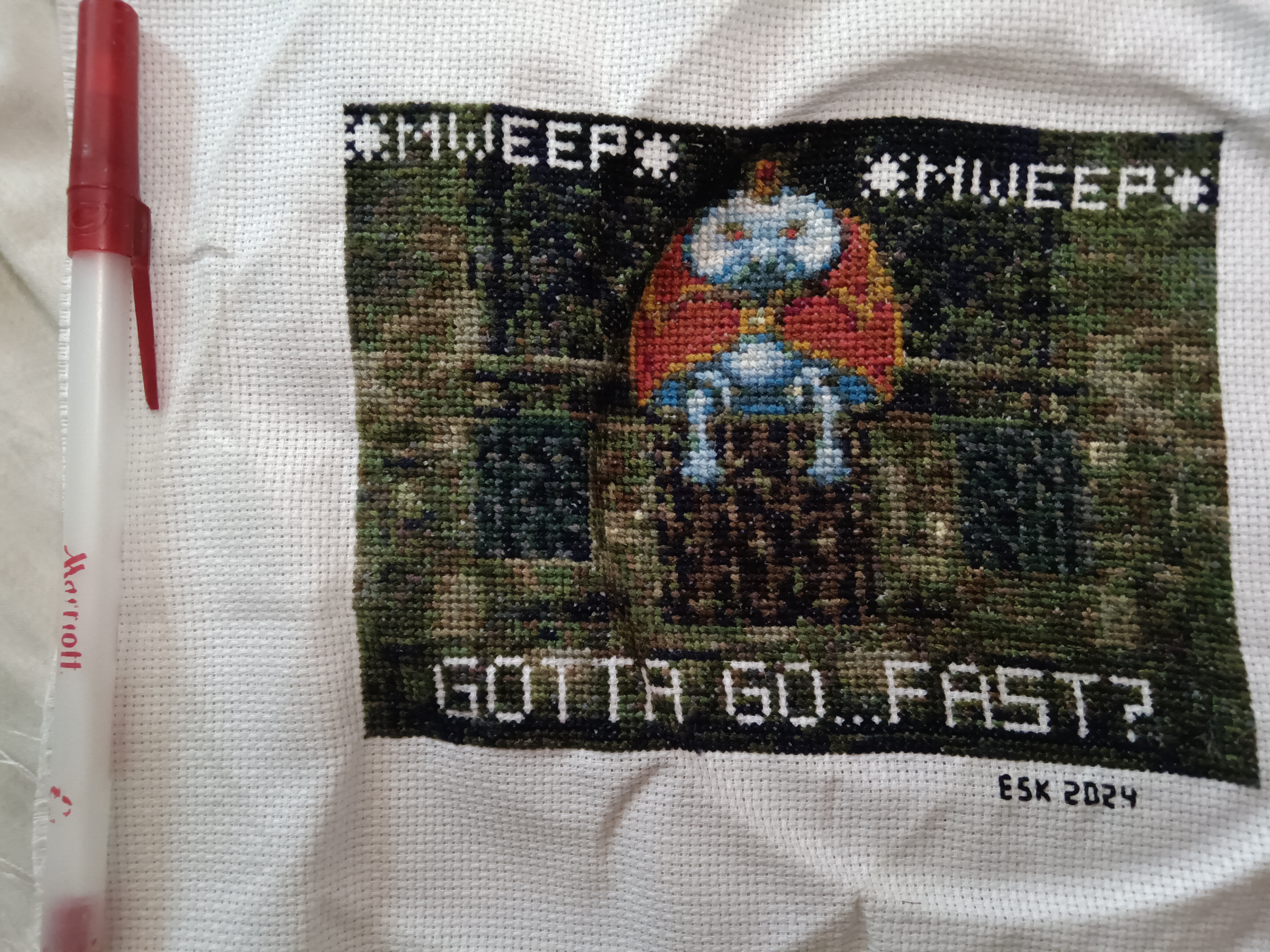 Meanwhile, we can look back at all we've done with this one. Overall, pleased with how it came out. N64 graphics don't translate to stitching as well as NES ones, but we have King Zora, have his throne room. And I think speedrunners, especially those of Ocarina of Time, will get it. Pen there for scale and it amazed me taking the picture how small it is. We packed a lot into it 99x71 stitches. I think not stitching the text was the good call and I like how it almost stands out more because it isn't stitched. There was some white (couple different shades, actually) in King Zora's face, but we did stitch those to keep the texture and all the same. I tried signing in white over the top of the picture, but that wasn't working/looking good, so I took it out (which was a little tricky, trying not to undone the picture) and just signed it below the picture. Have to go back and see what I did for Twilight Princess since that was also all completely stitched.