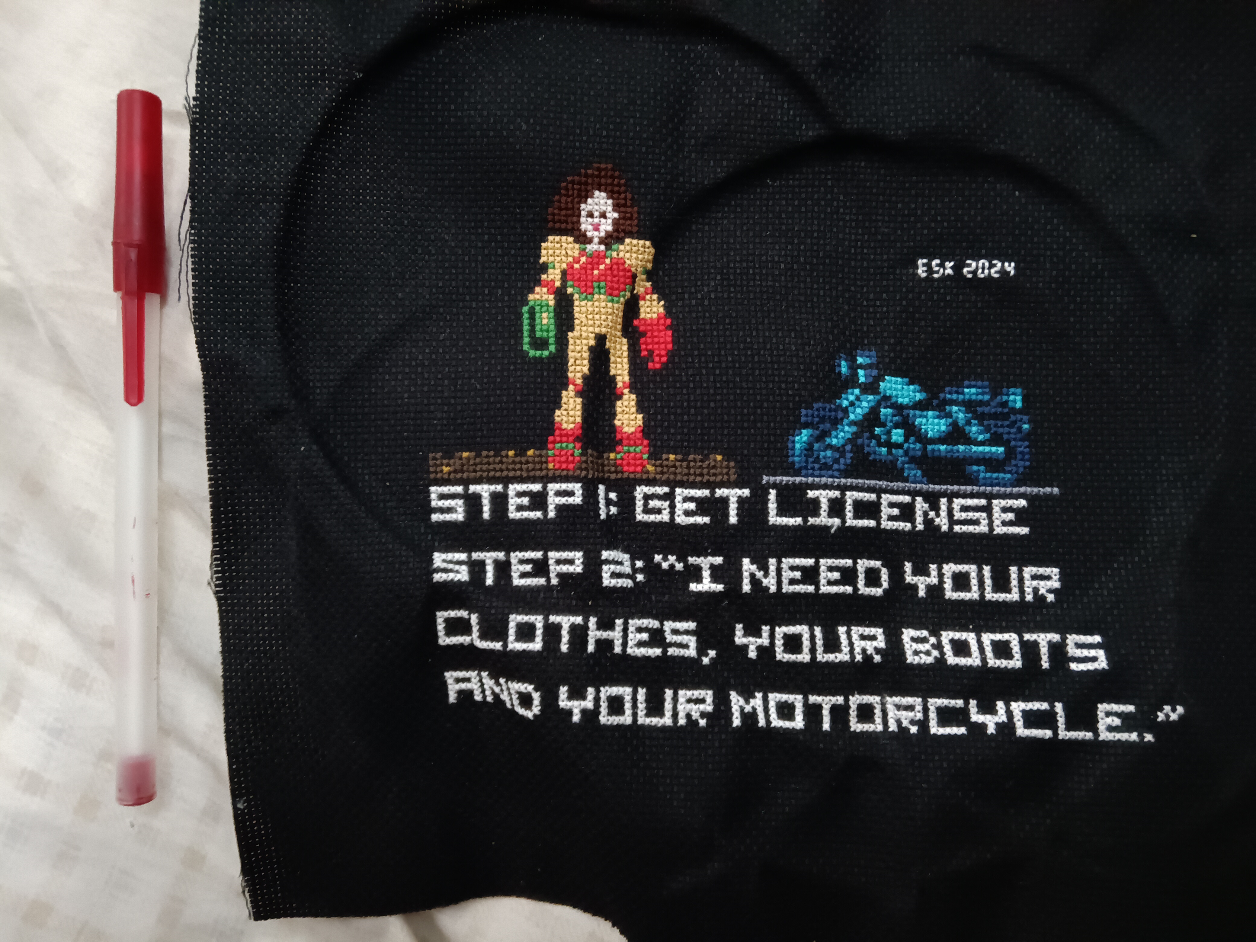 Below is the list of colors used for this on the off chance some else reads this in the future and also has a female friend or relative learning to ride motorcycles and wants to stitch it (hey, you never know). Couple of notes: obviously, we did this on black cloth to save background stitching, thus went with white text. When throwing the pattern together, I did the text first on a usual white blank page, so the text is black. Didn't seem worth the time to change the text color when I put the pictures together since I knew it was going to be white for the final product. Also, I went with a darker brown for Samus' hair and eyes because it more closely matches the color of my friend's hair. All colors listed are DMC