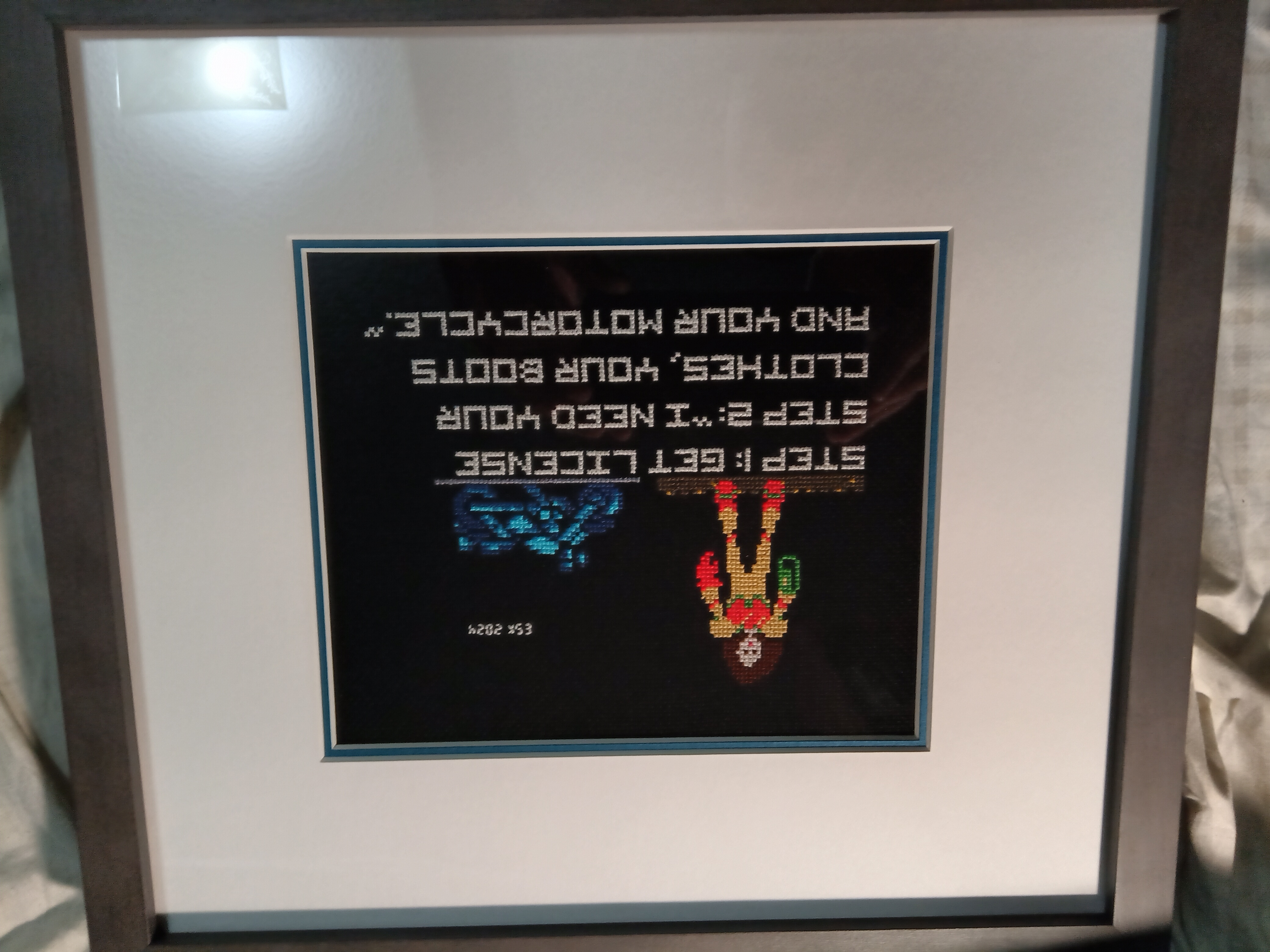 Suprise picture is complete. So, found out a couple of weeks ago that a friend of mine has begun pursuing her lifelong dream of learning to ride a motorcycle. While I wished she'd maybe chosen a little less dangerous hobby, I appreciate that she has this dream/goal and is taking steps to accomplish it. So, the idea came to me to put something together for when she gets her license. I have no idea how far or close this is. Just found out about this new hobby/goal a couple of weeks ago and she said she's done some riding, but wanted more practice. And I don't have a further update. But, dropped this picture off at The Artery a little bit ago, once I have it back then we can present it to her immediately if she's already gotten her license, or hold it until she does. Her birthday is today and I knew there was no way I could have it stitched and framed in time. I mean, I did just finish stitching it today, though we did have the delay at the start I mentioned last post.