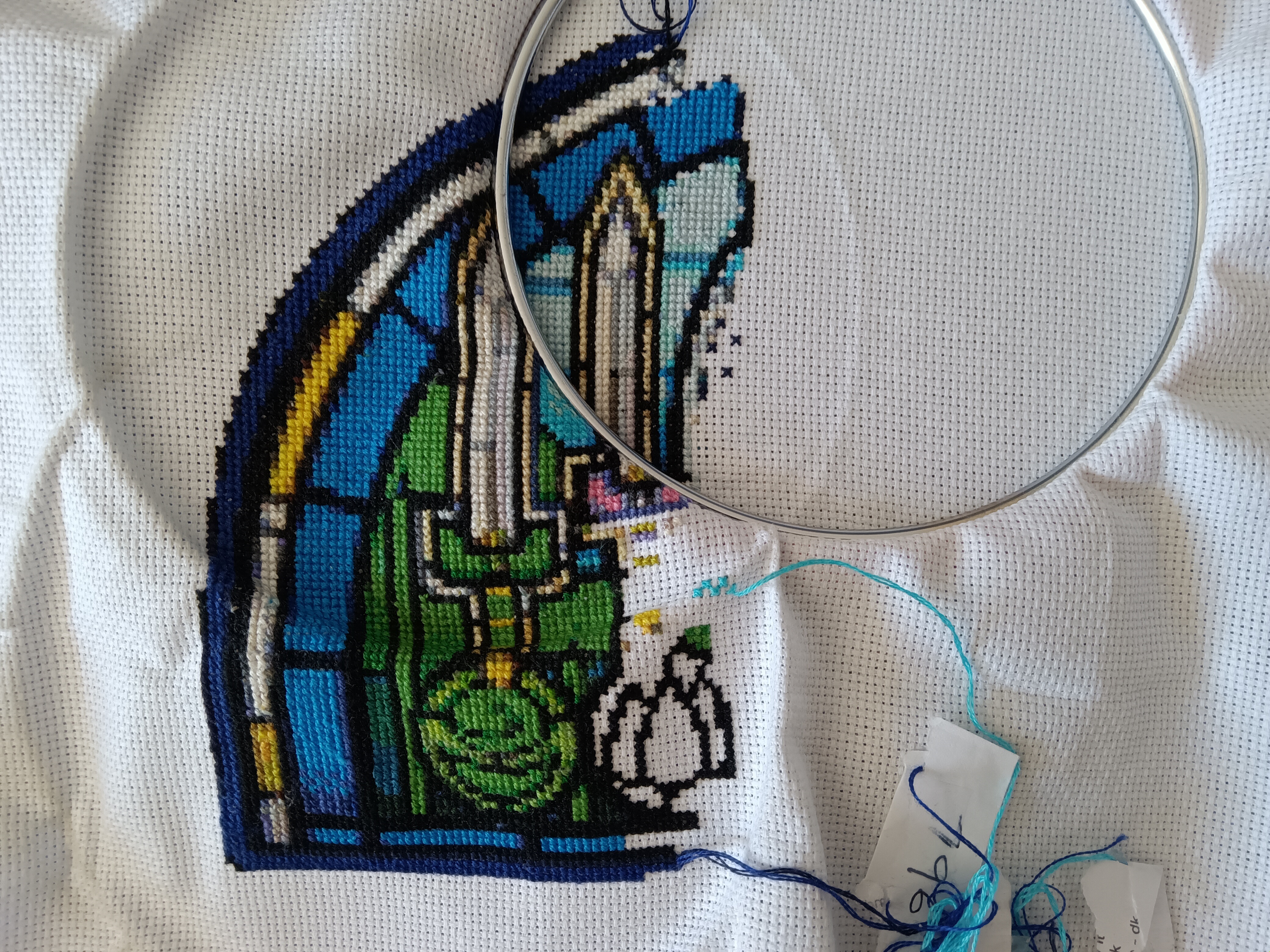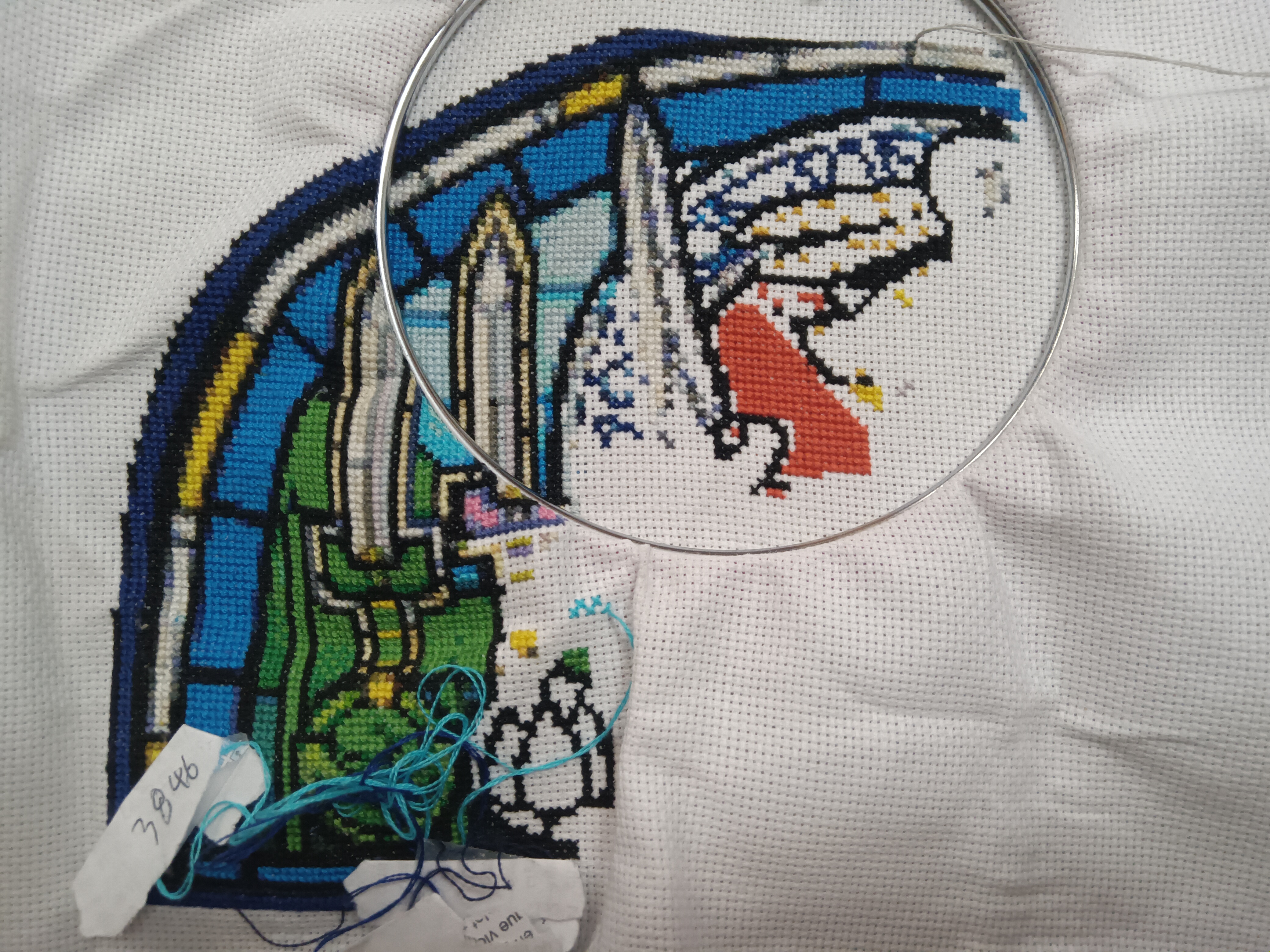 The top of the pattern calls for a row of off-white stitches. Because the whole background was intended to be stitched, they would have fit in texturally. At this point, I am unsure whether I will do that row or not. It is all of 5 squares above the top of the stained glass/main picture, so not doing it won't throw off the balance of centering the picture for framing. More than likely, I'll do a few stitches well away from the picture, just to see how things look, do the stitches stand out (color-wise) or look out of place (texture-wise) and go from there. They go across the top, almost all the way, but aren't on any of the other sides, so we're looking at 100 or so stitches, which I could likely do in an hour+. So not a lot of time save if I skip them, but not a lot of time investment if I do do the row. Because I'll be working on the top of the picture in this hoop and thus in a position to start the row, or not, I'll likely make a decision one way or the other these next couple of weeks.