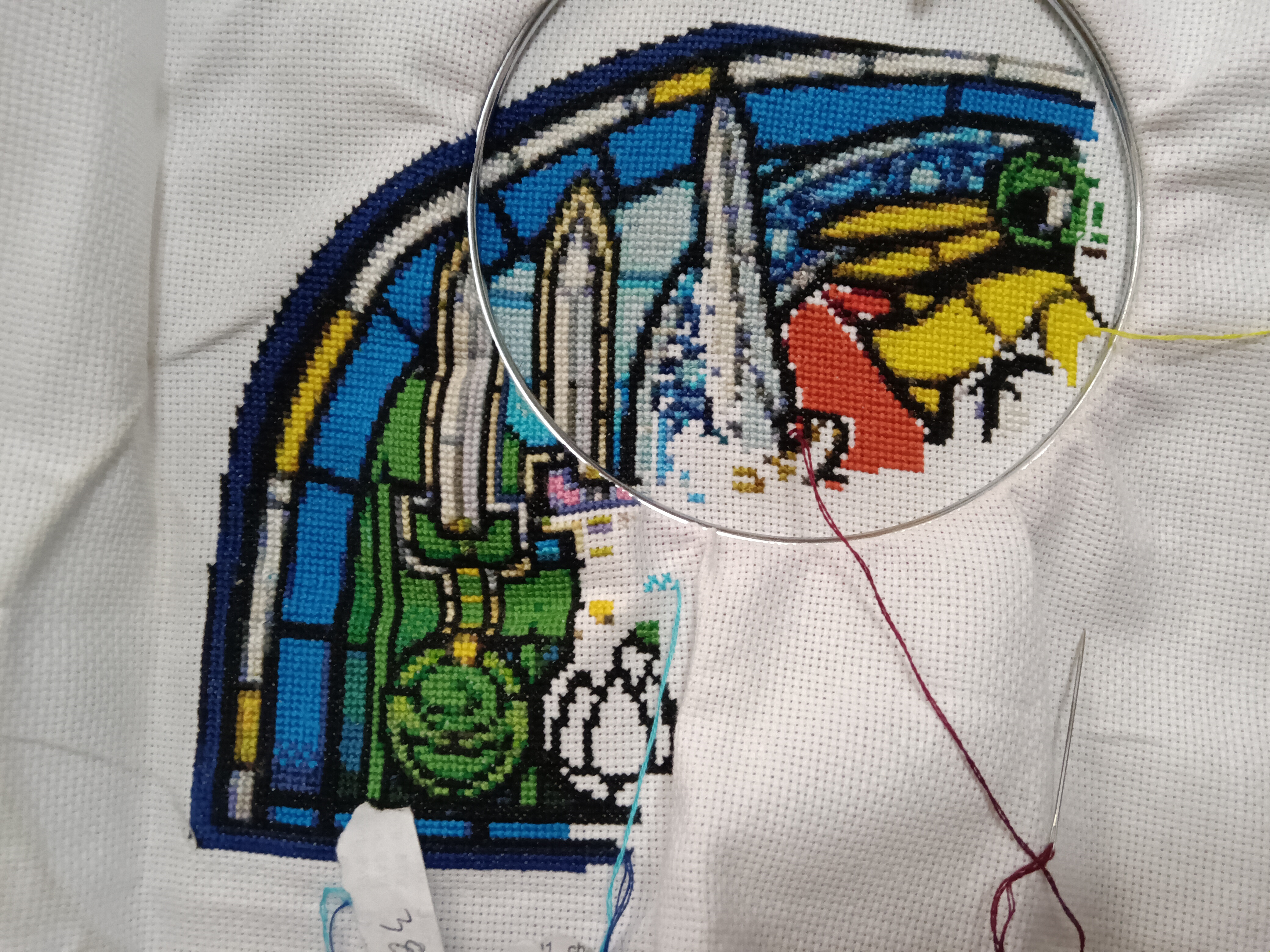 Lot of detail stuff and stitches here and there, so it maybe doesn't look like we did as much work in these three weeks than others, but we still put in our hours (now at 124, including today). And we finished the left/upper left of the hoop, which was part of my main goal. Plan this week is to fill in the bits around the orange patch and the small spots here and there around the sword. Think at that point, we'll move the hoop down and a bit to the left to connect up with our previous work. So next pic, we should have Link's sword and hand done, the second elemental jewel and at least part of Link's shield. So we'll start getting some more identifiable objects and things to look at. We did finish Ezlo's head (bird on top of Link's head who serves not only as Link's hat in the game to give his usual look, but also there to backseat/direct the player where to go or what to do), so I'm pleased I was able to finish that up today in time for the pic. And we've done most of Link's hair. If the hoop were a half inch or so to the right, I could have finished up the last big patch of Link's hair, but we'll have to get to that in a few weeks. The halfway point horizontally of the picture is right about where Ezlo's beak ends/the green of his face starts, to give some indication of how far along we are. Obviously need to fill in down from where we are, including some more to the left, but I think we can be about halfway through by the end of the year. Which would put us at around 170 hours. So 350 hours total seems like a reasonable estimate at this point. Lot can change before then, so we shall see (Link and Ezlo's bodies will go pretty quickly, but looks like a lot of small stuff on the right side of the picture).
