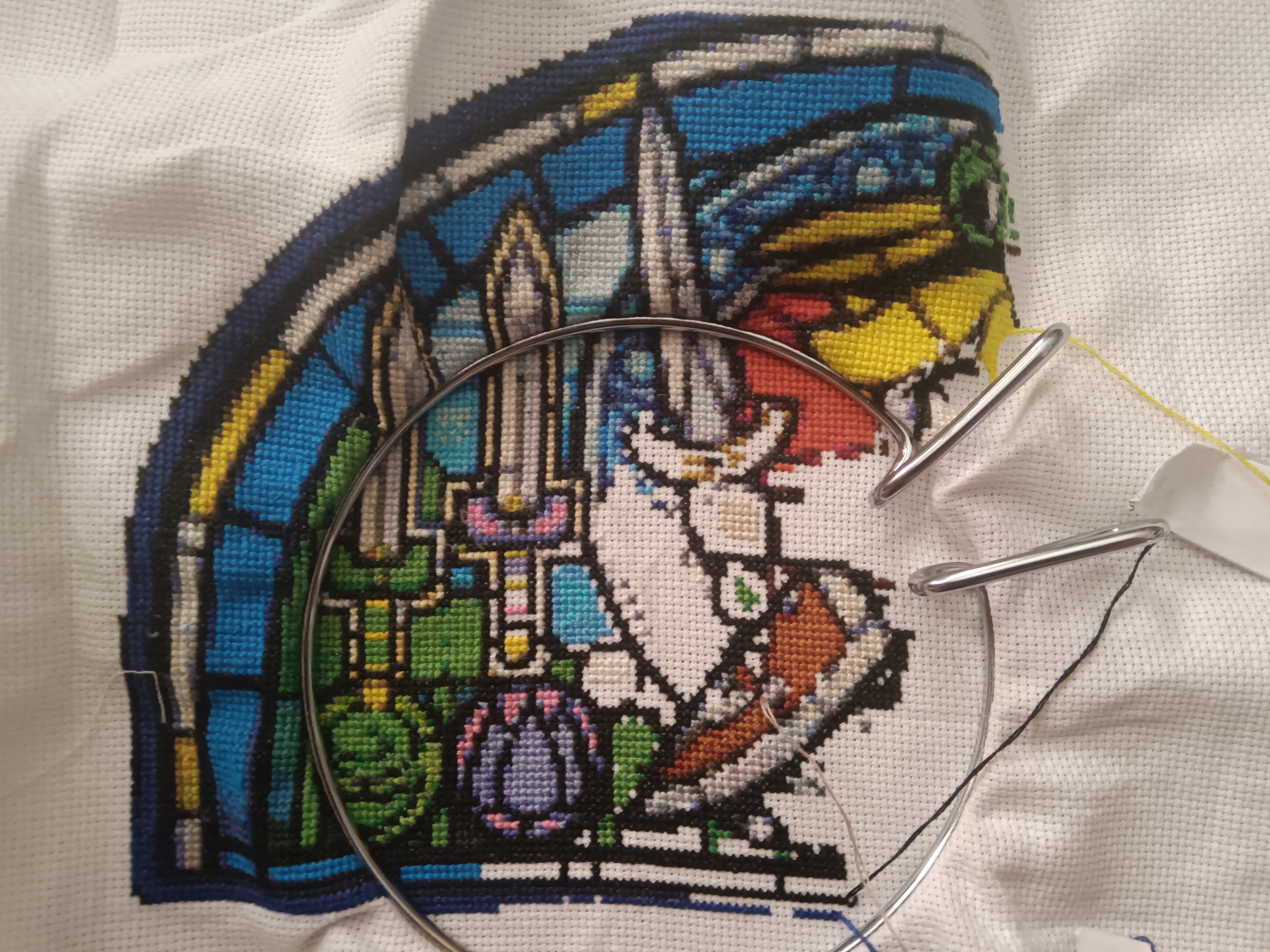 Shared the pic with a friend of mine and her reaction was just "wow". I said if she thought this was impressive, what is she going to think when I do the second half? I think we'll find that after I finish this, that Twilight Princess will still be my most impressive looking piece I've done. But this will be a close second. I'm definitely excited to see what the final product looks like. And I can't wait to talk to The Artery about framing. Because there's so many colors and shades, I'm looking forward to seeing what ideas they have about what to focus on/draw out. Because of all the white background, simple black frame might be best. But maybe a dark blue or something to tie in with some of the border of the picture? And bright green matte to go with Link's clothes? Should be a lot of fun. But we've got a ways to go to that point. 160-175ish hours left to stitch, that's about 4, 4 1/2 months. Have about a month break for SGDQ prize, so finish this mid-May?