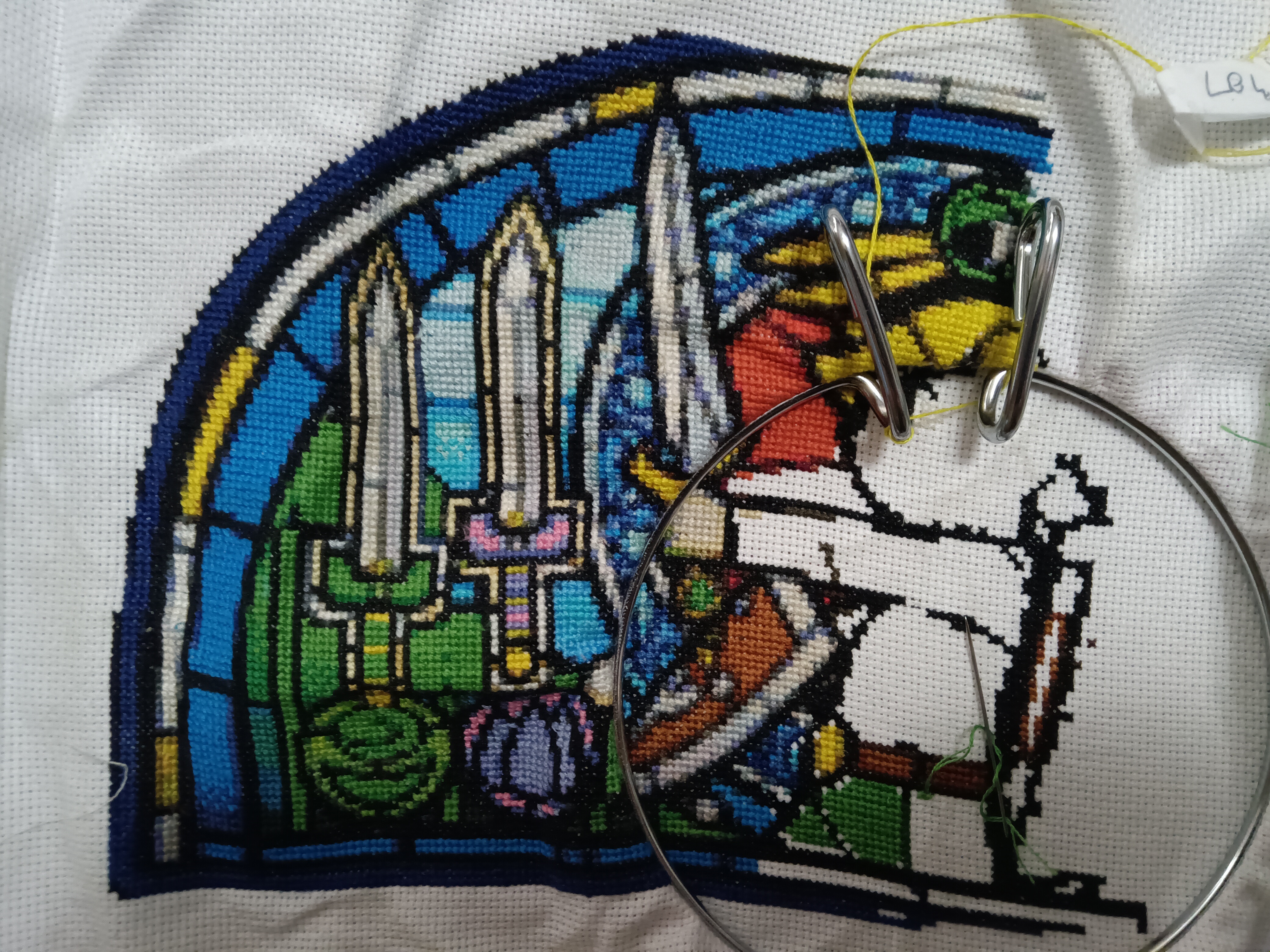 Don't know if 150 hours to do about half qualifies as "zooming", but I am pleased with the progress we've made. Have 4 stitches to do to finish off Link's shield, so we'll knock that out first thing tomorrow. Individual stitches for the shield, but I look for other spots the same color is used as long as my needle is threaded. In the course of doing those four stitches, we'll knock out some other stuff. His belt buckle and hilt of his sword should be mostly done by the time we end stitching tomorrow. Soon as I finish the shield, though, my focus is going to turn to doing the bottom rows, then hilt of the second sword on the left of the hoop, then work our way right. Just eyeballing things today, guesstimating how much I can stitch a day, I think I have a decent shot at moving the hoop the end of next week. Depending on how the middle/right side of the hoop shakes out, though, I may spend a few more days filling more stuff in before we move again. But most certainly, by the time we take another pic in three weeks (this one was actually after four weeks, so a little more work was done/could be shown than usual), we're heading to the right and just over the halfway point.