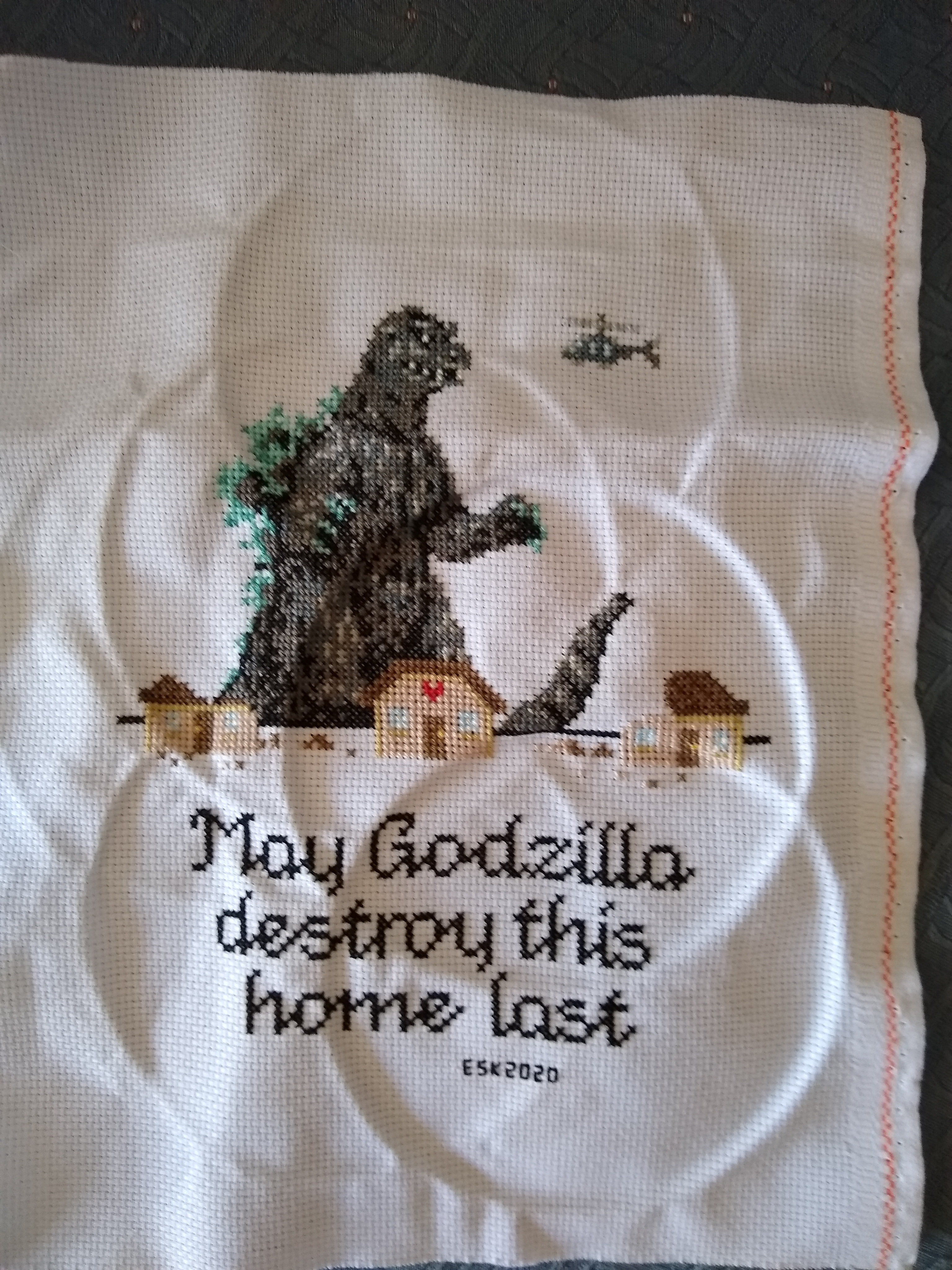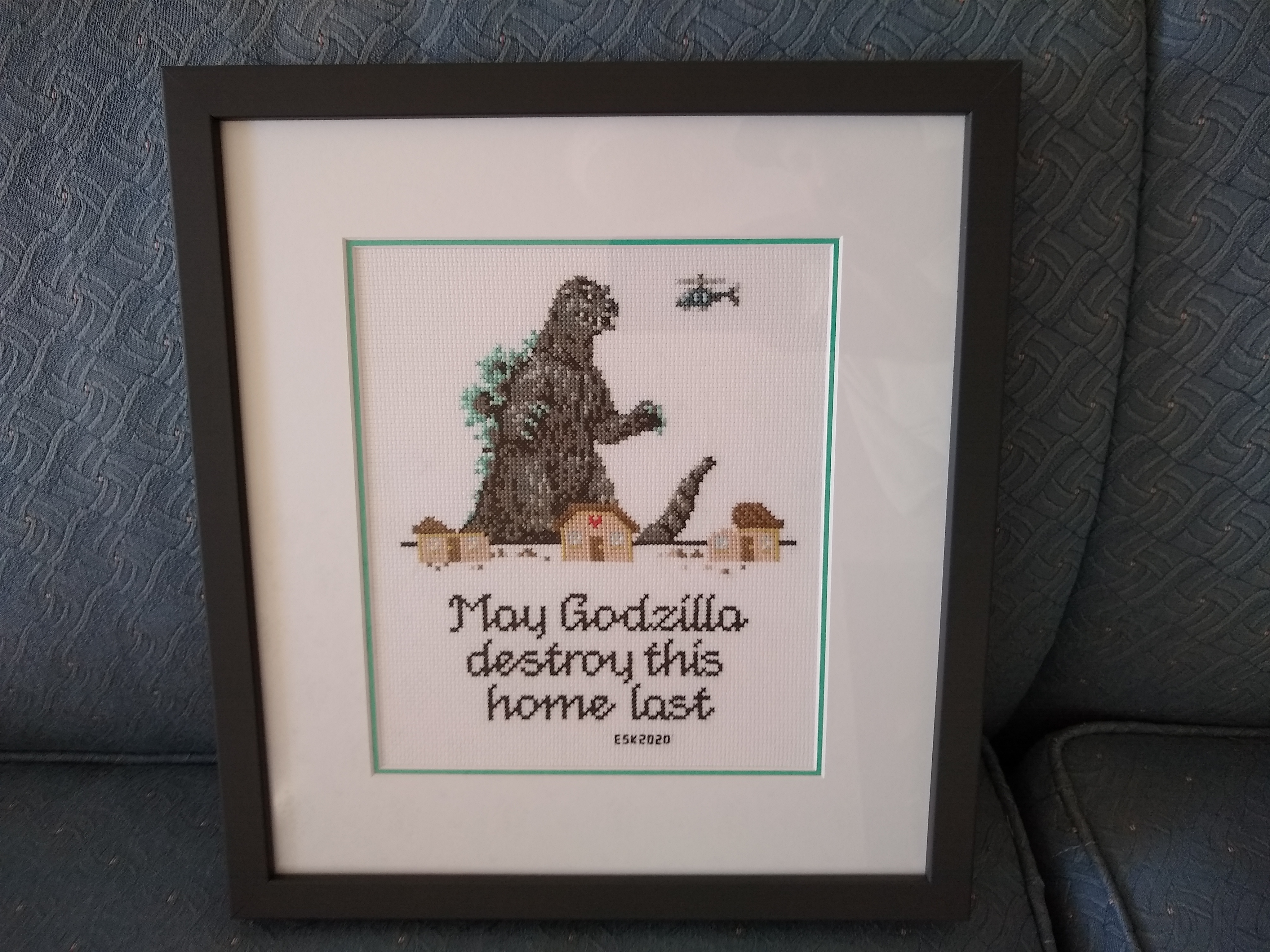 And we're finished. Made it in by the end of the month and I didn't even have to push things or do any extra work each day. I was surprised how quickly this came together because there is quite a bit of stitching for Godzilla and the houses, but, as they say, one stitch at a time, just keep plugging away. Dropped it off at The Artery this afternoon, so we'll see what the final product looks like, but I like what we have here. Various grays for Godzilla himself really make a difference as opposed to one solid color. Working on it/looking at it up close and in a focused area, you really don't see it, but once you step back and look at the whole picture, it looks good. Not something I would have thought of doing, or been able to make look good, but that's why I stitch patterns, rather than create them. :) Think my friend will be pleased with this, and we've got it done in plenty of time to get it to her for Christmas (barring any frame backorders or the occasional other supply issue that has plagued a couple of my projects. But most have gone smoothly).