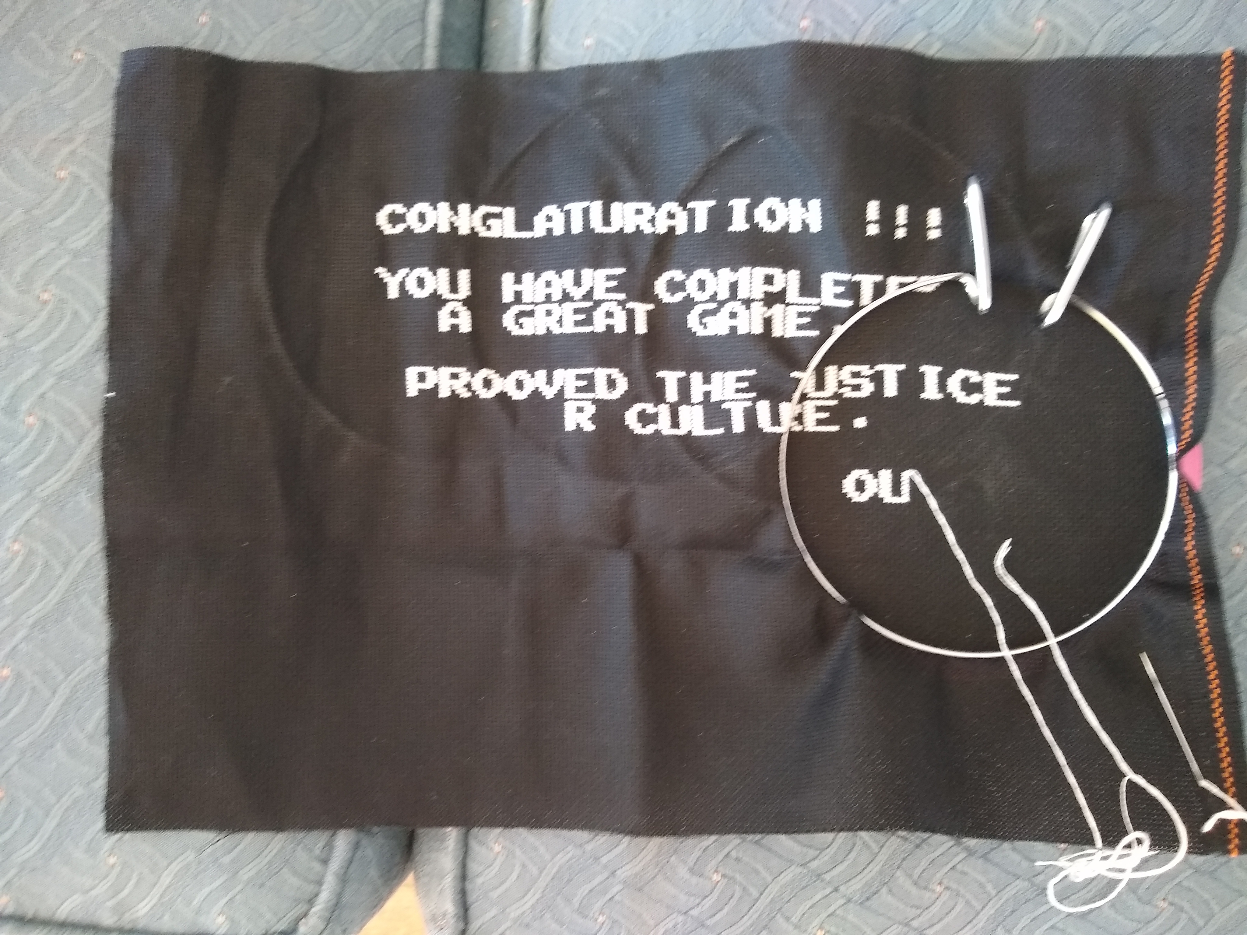 Meanwhile, we're moving right along with this year's AGDQ prize submission (or I guess it would be next year's, since the event is in January). Couple of weeks in, so this isn't going to be quite as quick as I first imagined. On the other hand, Looking at where I was after today, I think I can finish this up early next week, so we're ahead of my estimate once I started stitching. My goal is to get it at least turned in to The Artery before Thanksgiving, so they'll have it to work on around family obligations for the holiday and all that. And then I don't have to worry about them being closed extra days later in the week or anything. No real issues or mistakes to correct or anything, which has helped move things along. The fact that the letters all line up with one another is both a help, lining up lower lines/text, and something to watch out for: anything off will be obvious. For the most part though, it's been a help. Looking at finish the text this week, prolly three days to do the logo, as I said, we should be able to wrap this up before Thanksgiving without having to put in extra time. But we'll see.