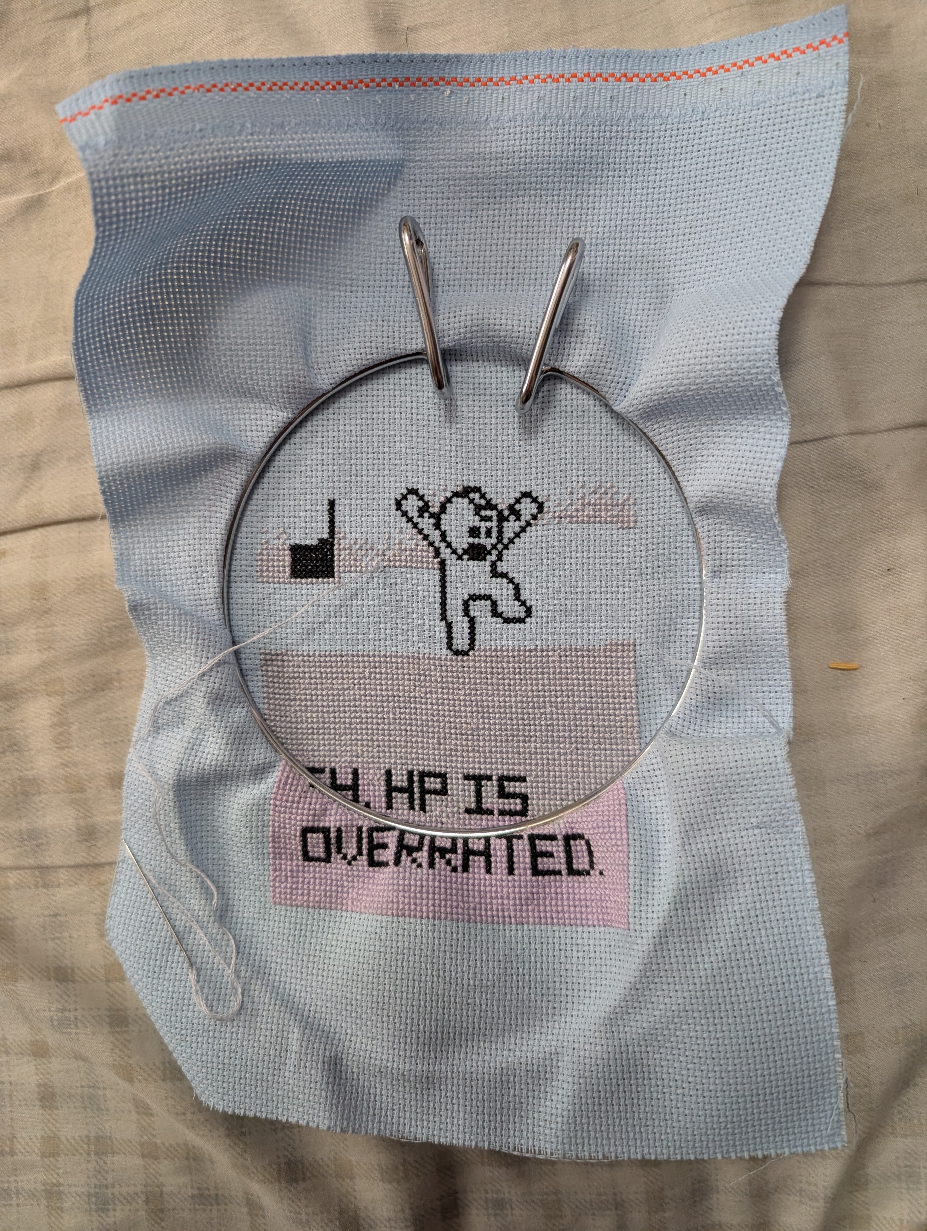 I started with the background stuff, to define my edges and all and figured that was going to be where the bulk of the stitch time would be going. But when I got to where the text would be, I stopped, stitched the text, then filled in the background around it. I thought about leaving blank spots for the text to continue with the background, but figured that would be too easy to make a mistake and not leave a spot where I needed one and so on. So stitched the text, then went back to background stuff. Generally, I've been going back and forth, left and right with the background. However, some of the text has five stitches in a row. I didn't want to run a thread over those spots, which wouldn't look good on the back (like someone would ever see the back