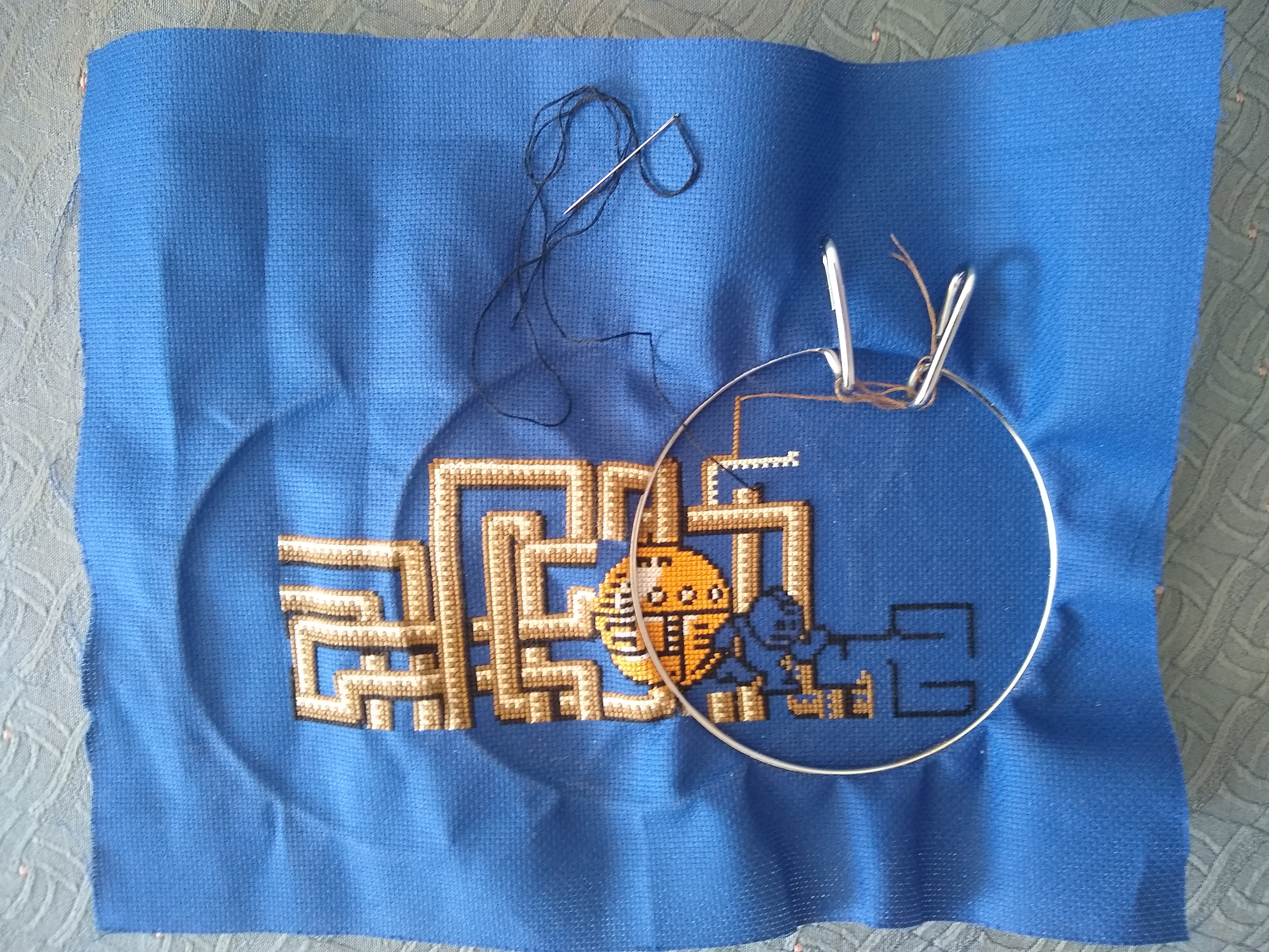 Progress is being made. And in fact, we can say the end is in sight as the black on the right side is the right border. So that's as far over as we'll need to go. Still a lot to do and we have been doing a little extra work here and there, especially on my days off, but we're still having fun. Finished most of the black today, so we at least have an idea of where the rest of the piping will go. Prolly tomorrow we'll color in Mega Man, just to add a bit more color to this and so we can have another aspect of the picture completed. Hoping to finish off this hoop next weekend, so next week will just be the upper part of the pipes, the metool (the little hard hat looking guy) and the text. Finishing by the 15th is definitely doable without having to go all out, I feel, but we'll see how this week goes. Only real concern at this point is I've used a lot more of the tan for the pipes than I expected, so will more than likely have to run out and grab another skein. Not a big deal, unless it happens to be out of stock in the nearby Michael's and I have to broaden my search. Off Tuesday, so I plan to run there just to see, figuring if I need it, I'll have it and if I don't need it, I'll have it for some future project. And if they don't have the color, then we start making other plans. As I said, might have enough to finish, but want to be a little proactive on this, just in case.