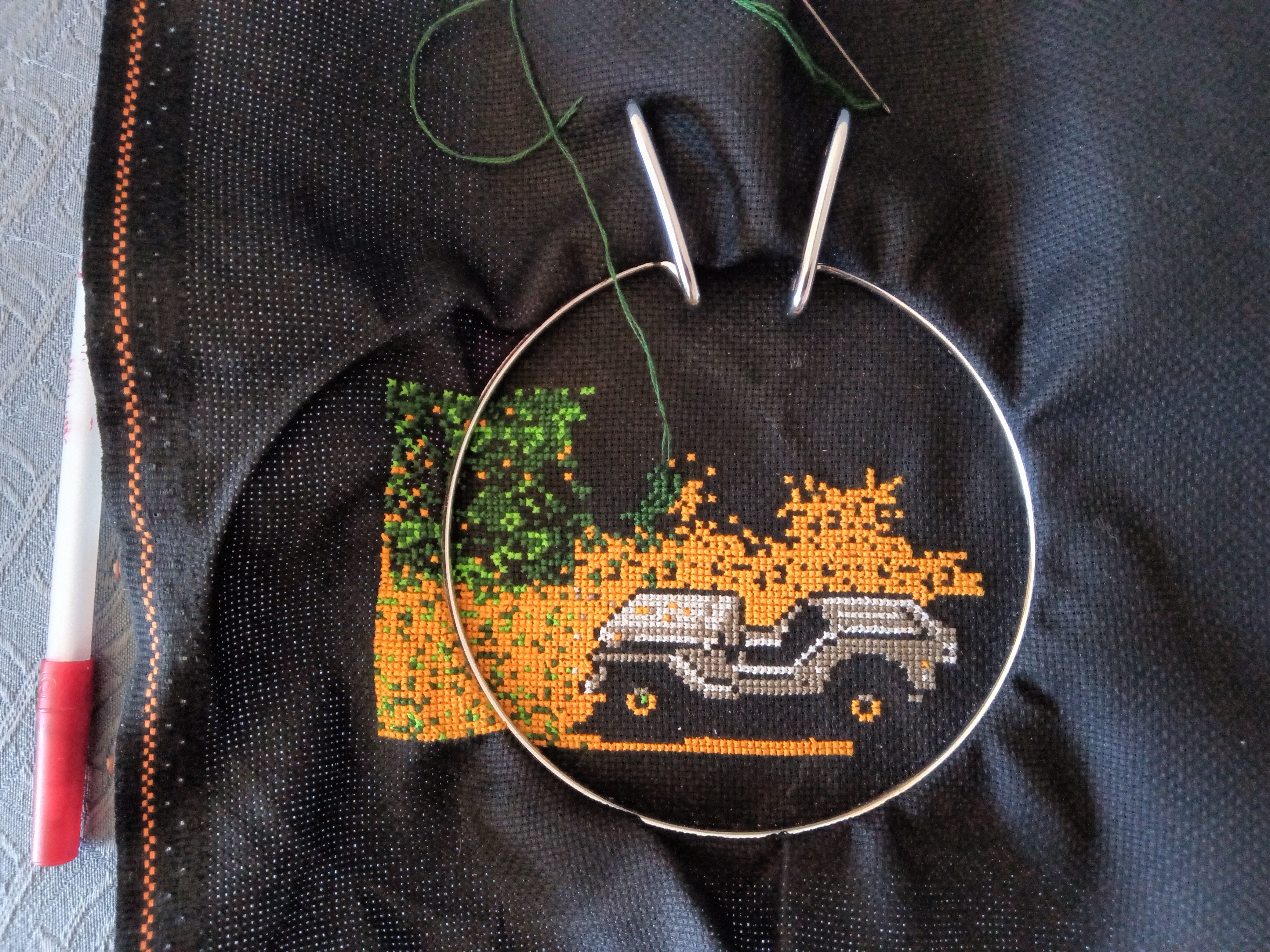 Thank you. Couple of days in, so things are looking a bit daunting with little stitched but lots of black cloth, but that's to be expected of course. Should have most/all the ground to the left of the jeep done by the end of the week and hopefully some of the foliage. The bottom 2/3 is almost entirely stitched, so that's definitely going to take most of our time. Setting mid-November as my goal/deadline, so we'll see how the first month or so goes and whether an hour a day is sufficient to finish in time, or we need to kick things up a notch. We aren't going to need to go hardcore/full time, but we may have to go to an hour and a half a day or so to finish by my goal. But we'll see. Did start off on the wrong foot though Sunday. Normally for my projects, I use two strands. Fills things in nicely, easy to use, it works. TP, though, called for three strands. Prolly could have used two, but we were trying to follow the pattern completely. So, we used three. Old habits die hard and I start this project and start stitching with three strands. Prolly would have worked, but we are using a higher count cloth here and two is easier to thread the needle. Got 30 or so stitches in on Sunday when I realized what was going on. And did think about just continuing and doing everything with three strands, but figured two would be better. So, we had to undo everything and start anew. So that was basically a day wasted. But, we're back in the two strands mentality, have yesterday and today under our belts as full hours of stitching, so we're back on the right track. And better to get the hiccup out of the way the first day so we've got smooth sailing the rest of the way.