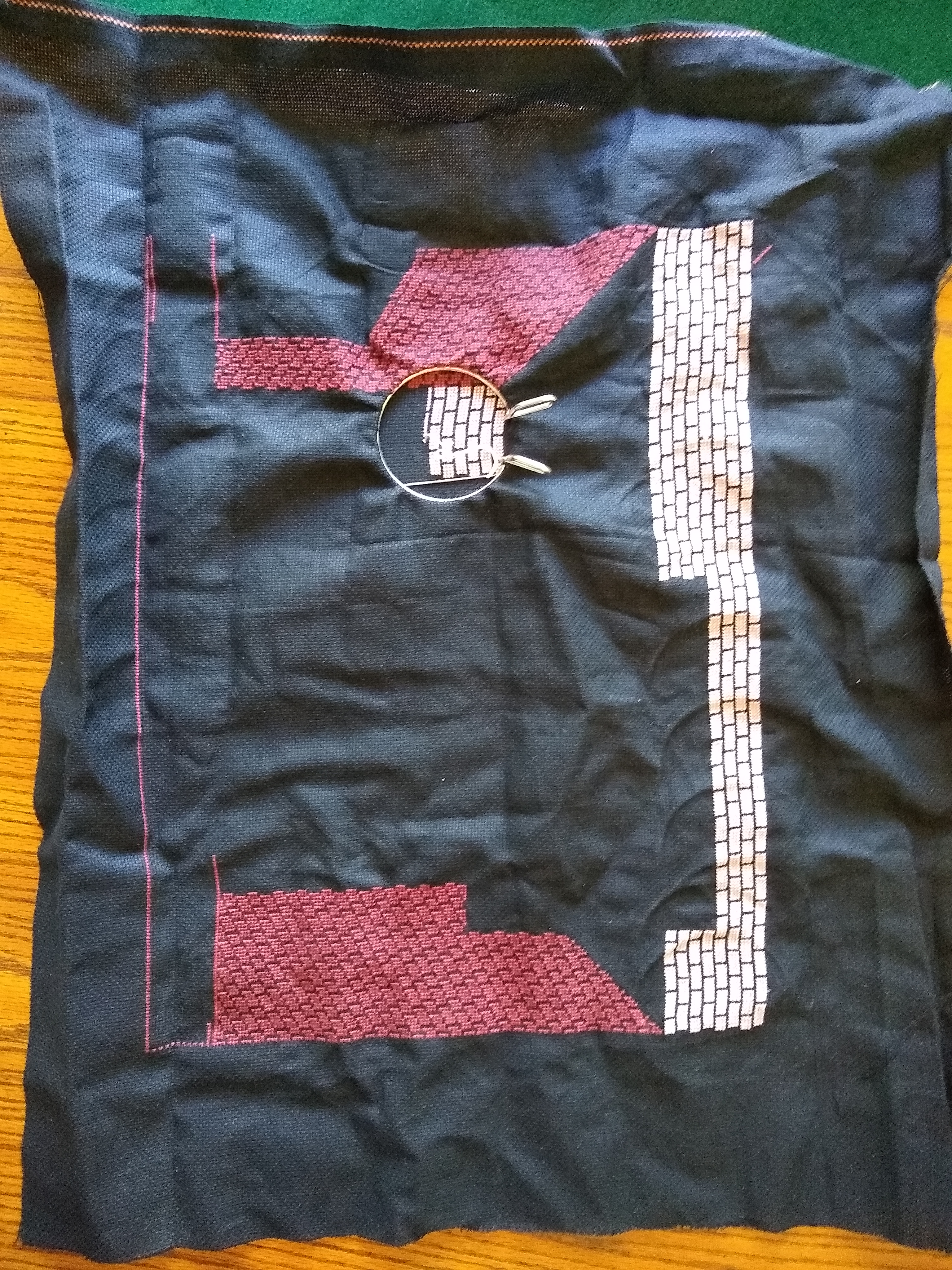 Two months later the bricks are done! Bricks on the sides, bricks in the middle, all the bricks are done. :) Actually finished them Monday but didn't have a chance to get an updated picture until tonight, so we can see I've started in on the lines across the bottom. This is my next big part to do and will just about be the last of the real tedious stuff. Like the bricks, though, I'm filling the hoop rather than just go straight lines. Means moving the hoop much less which will save quite a bit of time. I was a little concerned if things might show through or the back not look as clean, but those fears were unfounded. So, we're going up and down (which is actually right and left), filling things in, then moving on down and doing the next section. Figure the lines will take me until about mid-October to finish, 3-4 weeks or so. Then we get to do the text, Link (speaking of which, I think the silhouette of Link formed by the bricks looks pretty cool. Obviously I'm going to actually stitch him, but it made think about maybe doing some sort of a Shadow Link project down the road), Error, the table, the windows, some of the more interesting things. There's still quite a bit to do, so not sure I'll finish by the end of the year, that's a tentative goal, but the object is to have fun and do a good job rather than try to meet some arbitrary deadline (since this is a project for me/going on my wall, so doesn't have to be done by a certain date). So we'll see. Got Awesome Games Done Quick 2020 coming up in January and I've got a couple of ideas for stuff to stitch for that, so I'll set this project aside for a couple of weeks to bust a prize out, but in the meantime, we'll keep stitching away.
