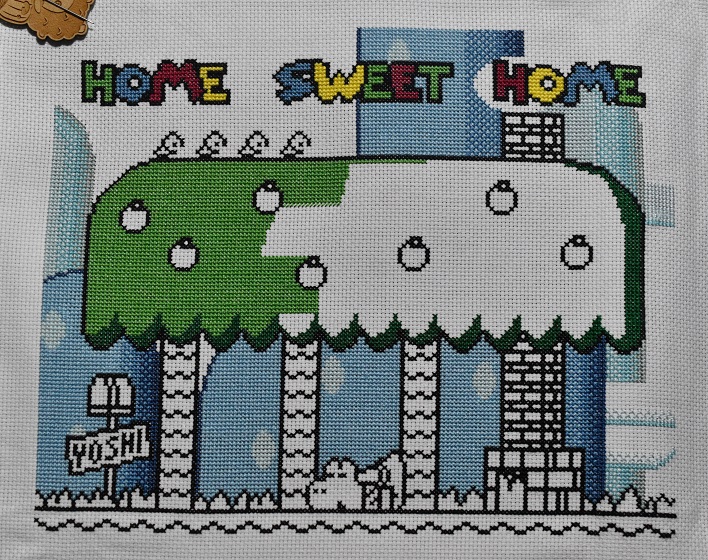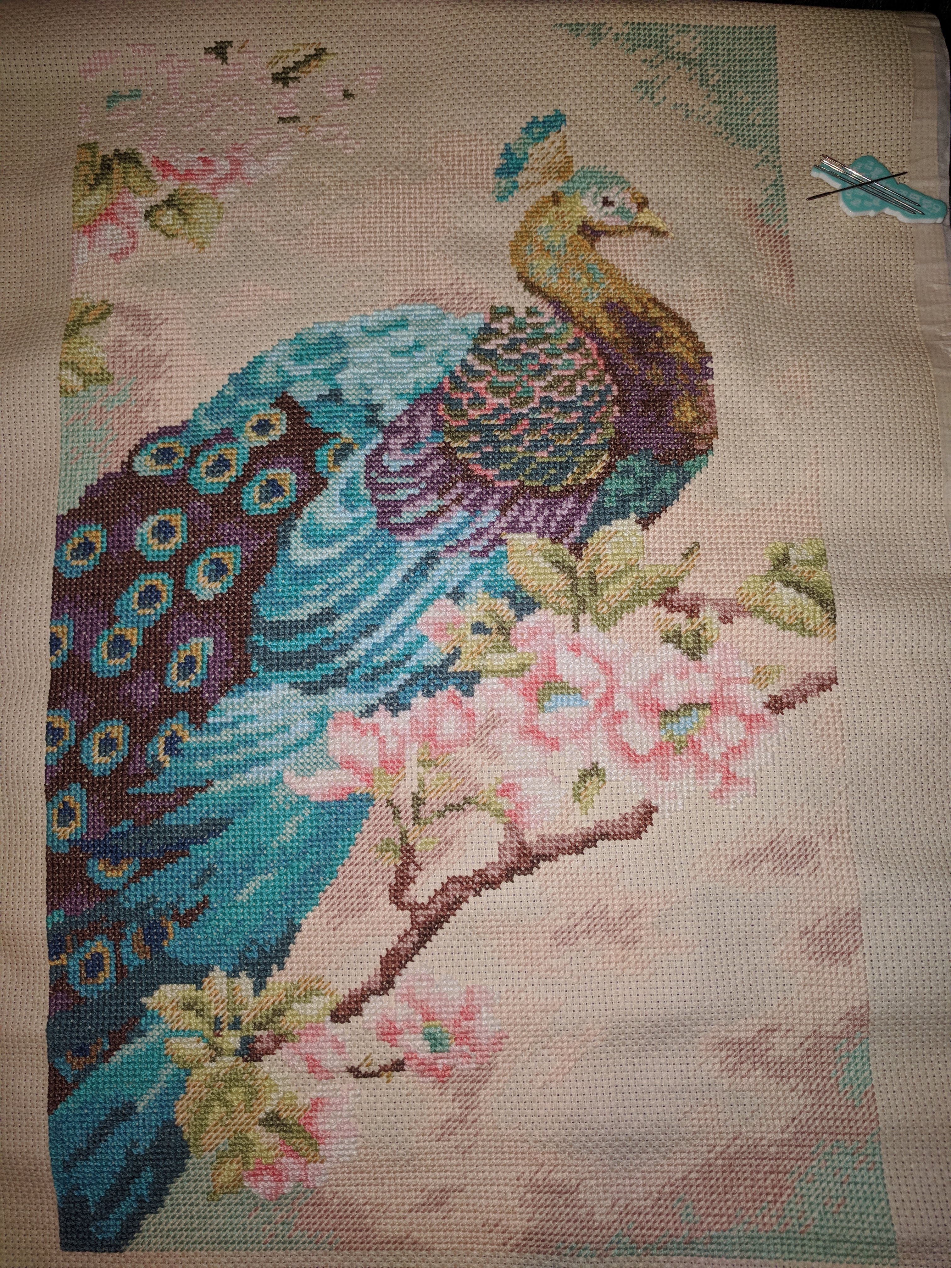 Here's my late update! Got through quite a bit of coverage and I predict maybe 2 more months to completely finish it off? The whole thing needs to be back-stitched which is a bit daunting. This challenge was surprisingly motivating actually, I'll probably be continuing it. It's really awesome to see everyone's progress!!