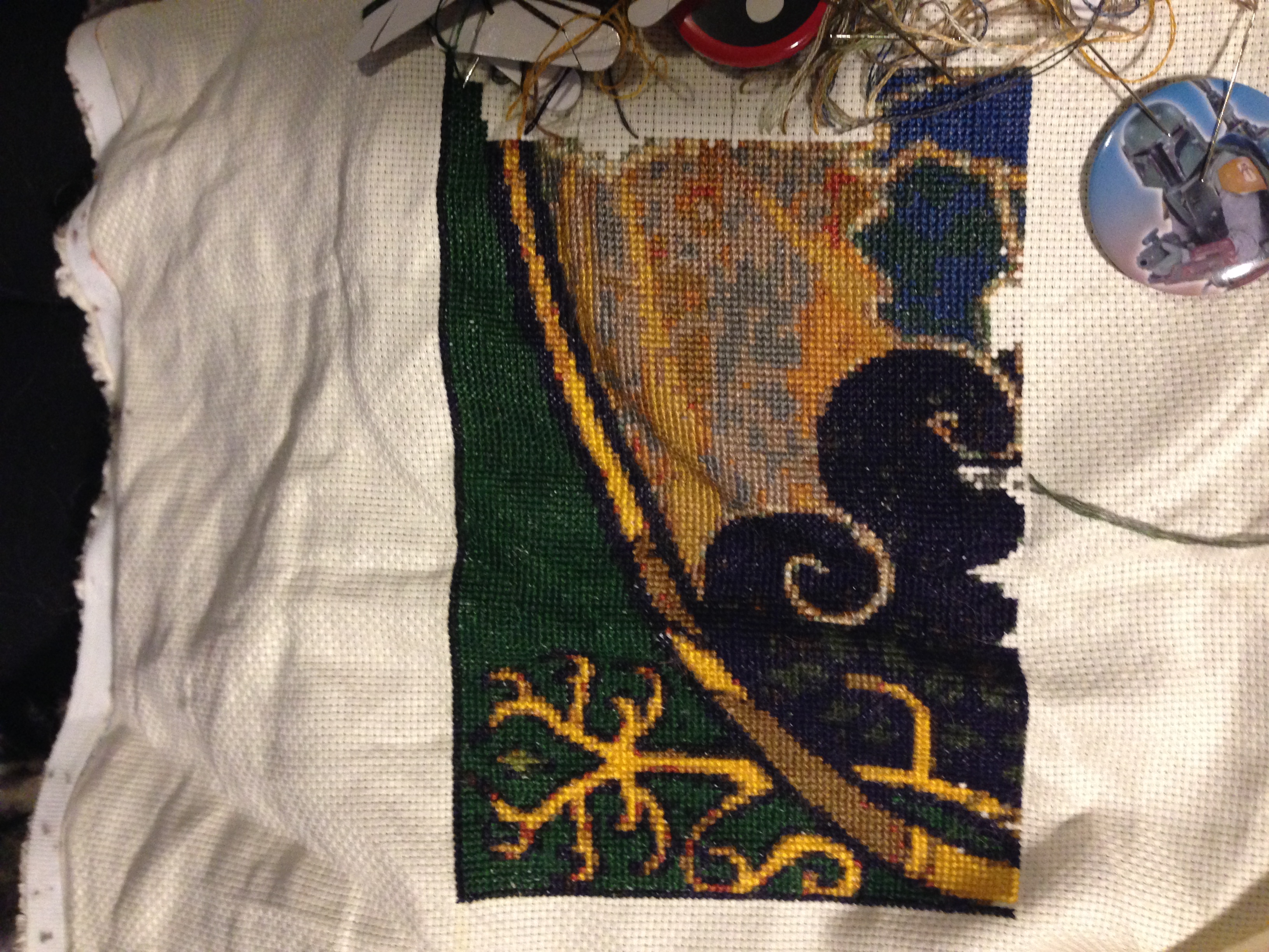 I'm stitching it! Even though I haven't even finished the first row, so far the pattern is accurate and it's easy to make some minor changes if you want. I merged the colors with the number 4, 14 and 63, 'cause they were pretty much the same, also I use Anchor 400 for both 23 and 52, because the one on the chart isn't available anymore. There were 2 more colors I couldn't find, but I changed them to another color without problems, I just can't remember their numbers.