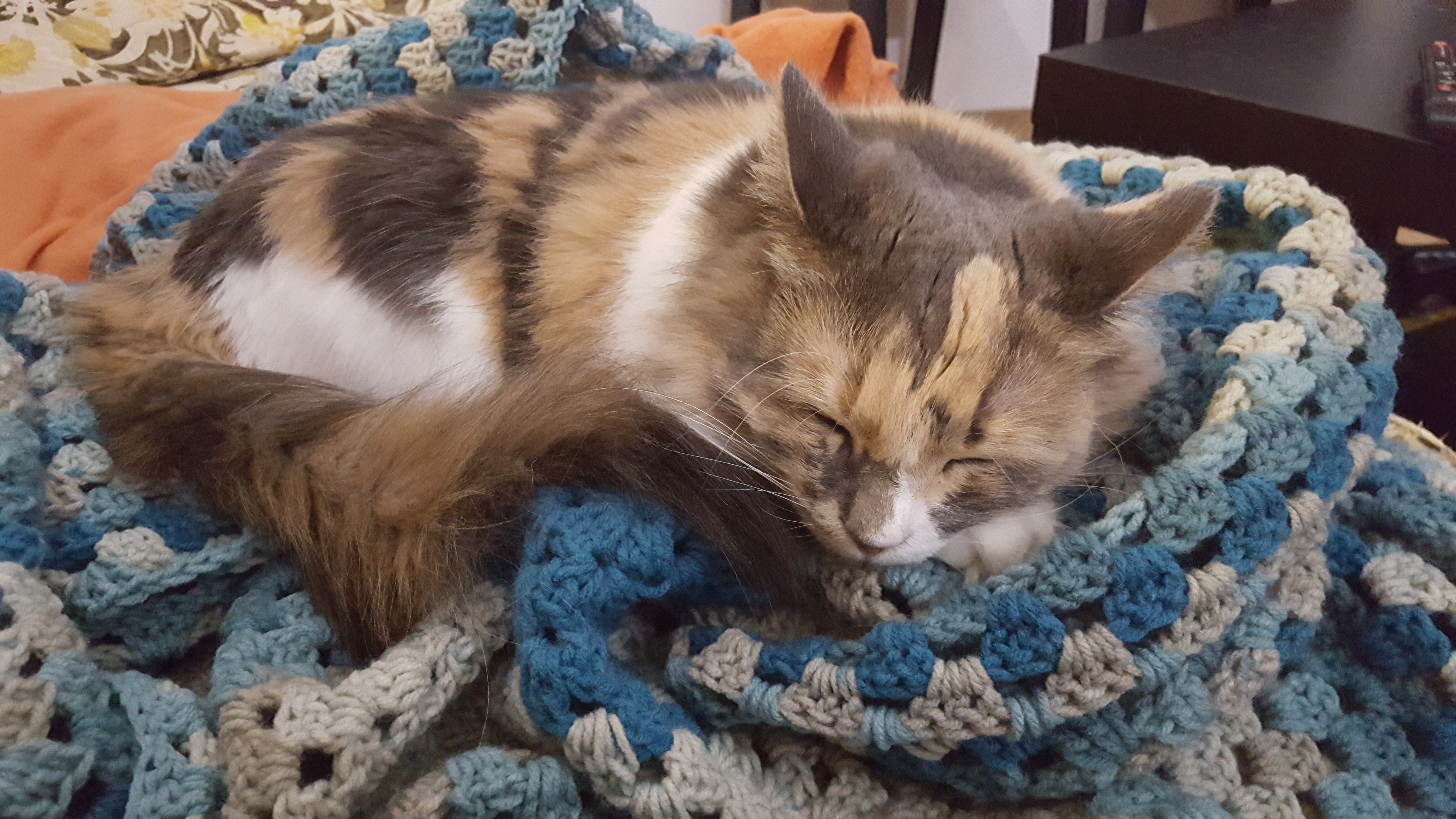 Here's my assistant helping with another blanket I was working on. She loves to curl up with me while I'm crafting.