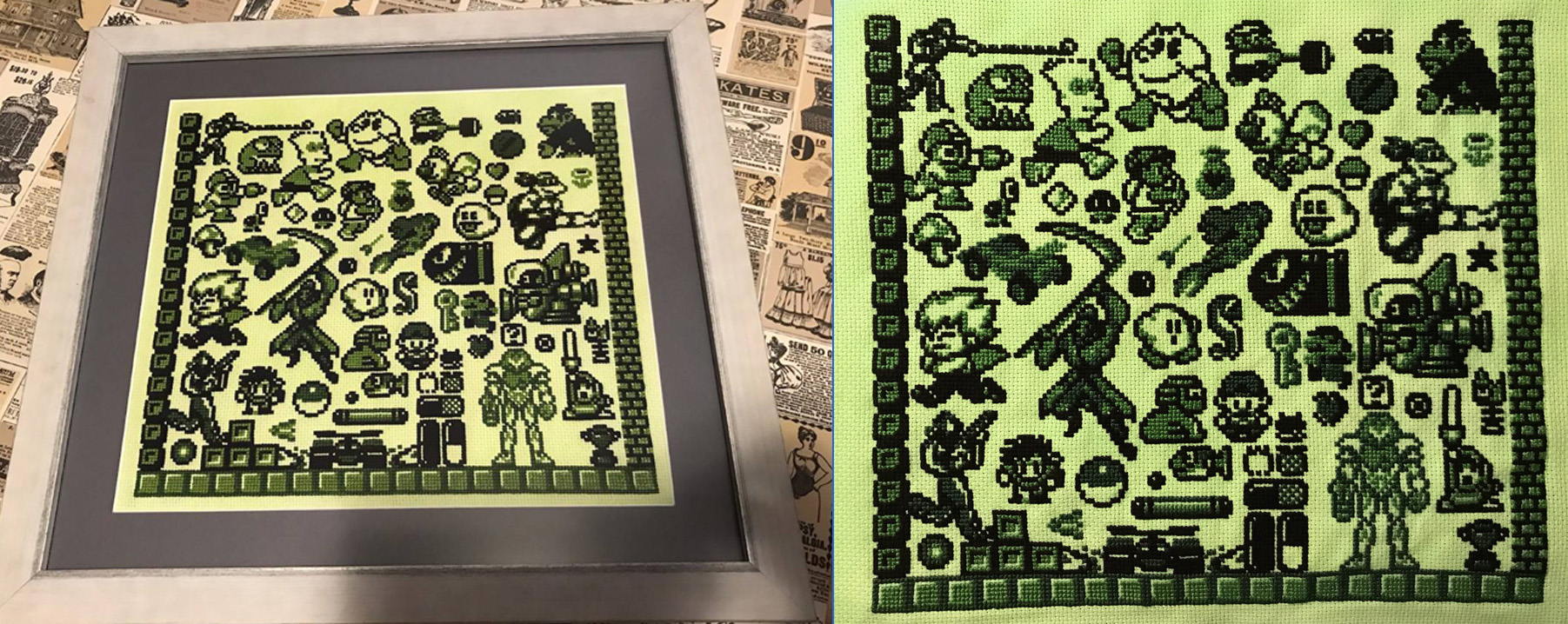 This is an homage to the original Gameboy. It is 160 x 144 squares (the same as the original Gameboy screen) and I had it matted in a dark grey frame matte and a light grey frame to reference the colors of the Gameboy. I used light green 14 count aida cloth and black and two shades of green (3345 and 470 were the string numbers). I referenced my favorite games as well as Rankers top 25 games. I created the pattern myself using photoshop and www.spriters-resource.com.