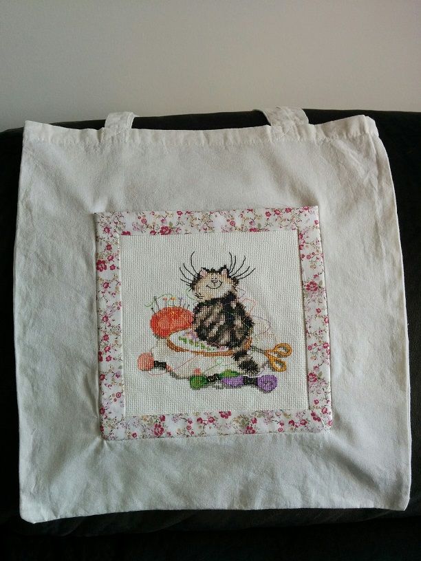 Project bag for my mother, with the stitching sewn on as a pocket. The pink floral fabric matches a pincushion I made her previously, and by coincidence also matches her travel sewing rolly kit.