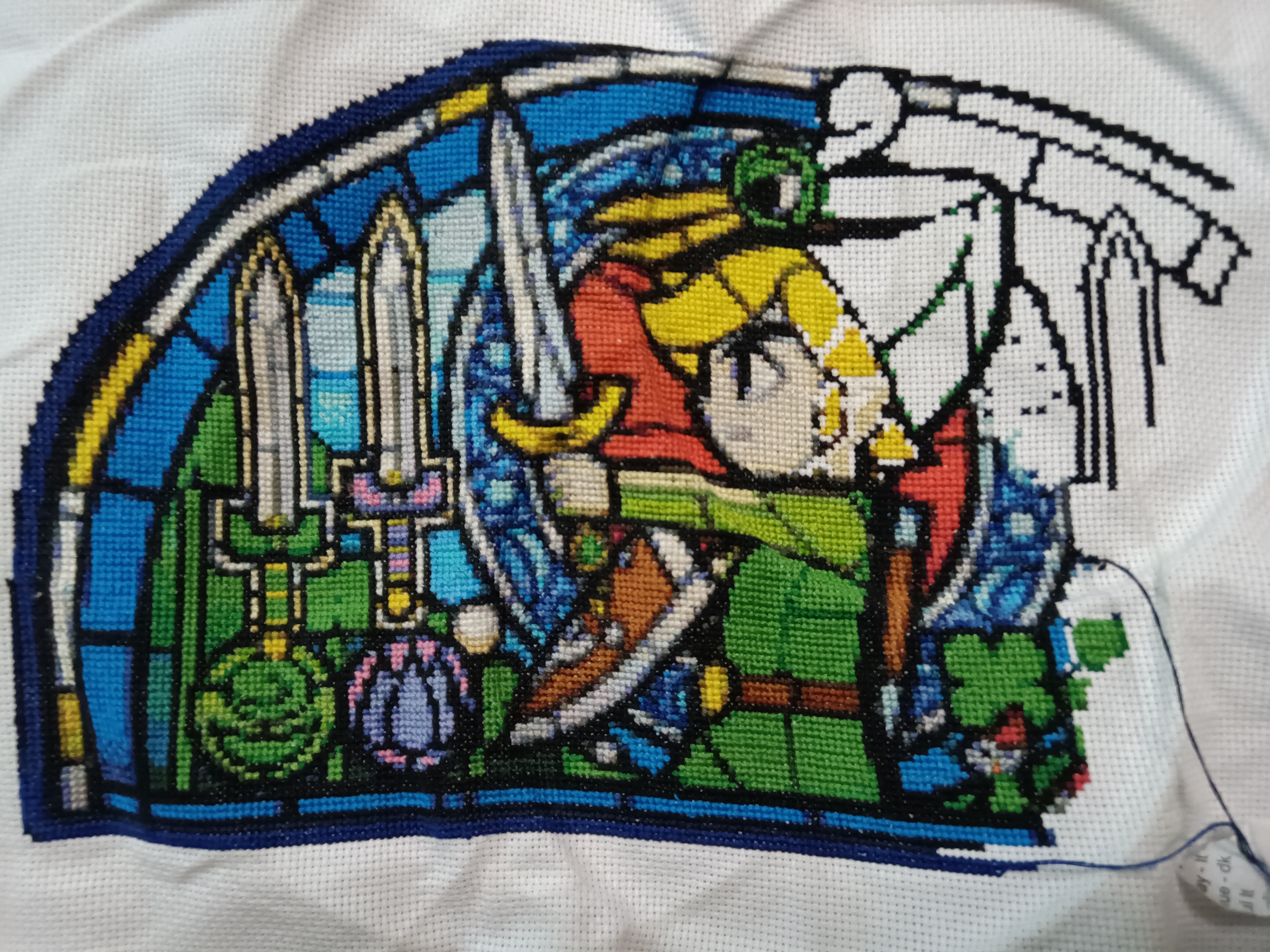 Thank you. :) Don't know if 150 hours to do about half qualifies as "zooming", but I am pleased with the progress we've made. Have 4 stitches to do to finish off Link's shield, so we'll knock that out first thing tomorrow. Individual stitches for the shield, but I look for other spots the same color is used as long as my needle is threaded. In the course of doing those four stitches, we'll knock out some other stuff. His belt buckle and hilt of his sword should be mostly done by the time we end stitching tomorrow. Soon as I finish the shield, though, my focus is going to turn to doing the bottom rows, then hilt of the second sword on the left of the hoop, then work our way right. Just eyeballing things today, guesstimating how much I can stitch a day, I think I have a decent shot at moving the hoop the end of next week. Depending on how the middle/right side of the hoop shakes out, though, I may spend a few more days filling more stuff in before we move again. But most certainly, by the time we take another pic in three weeks (this one was actually after four weeks, so a little more work was done/could be shown than usual), we're heading to the right and just over the halfway point.