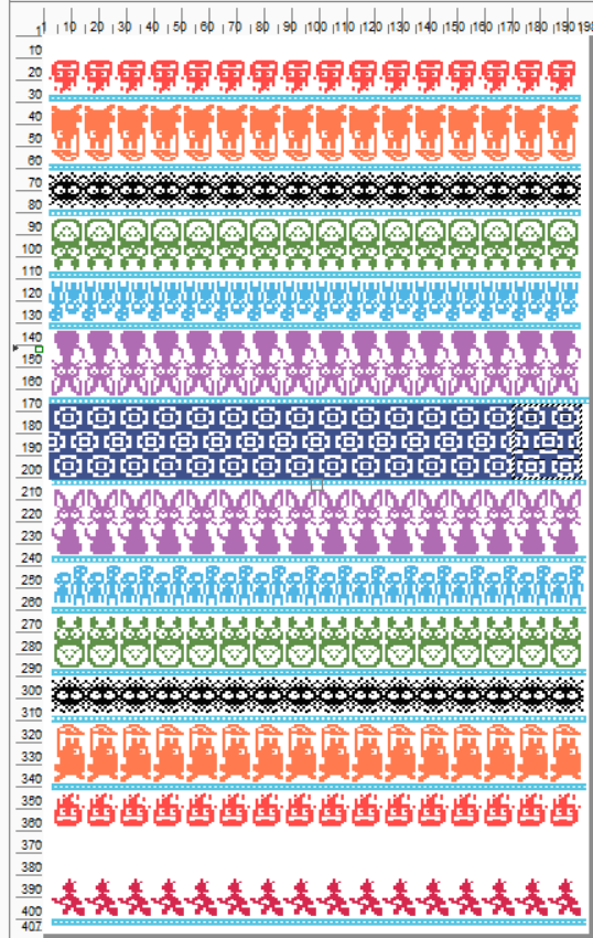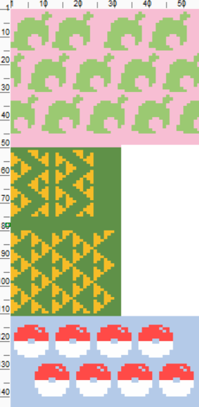 I threw together a few ideas, and did a practice with the animal crossing one. Forgot that it comes out backwards, opps! The repeat section must be 12 stitches wide, and each row can only have 2 colours, though I can change colours between rows. Not sure which row of pokeballs I like better...