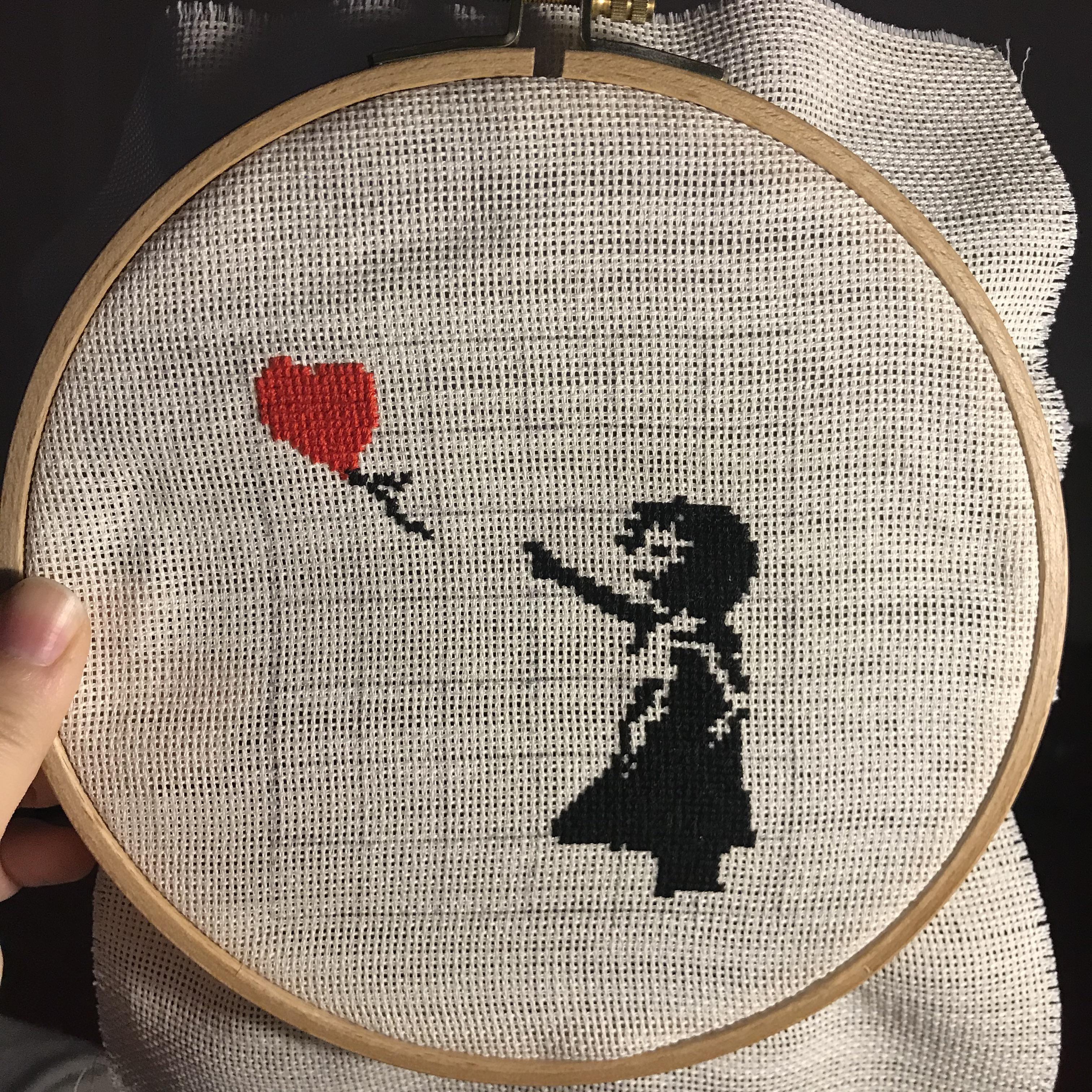 I found a pixelated version of the photo and grid the fabric to try to look alike to the picture.